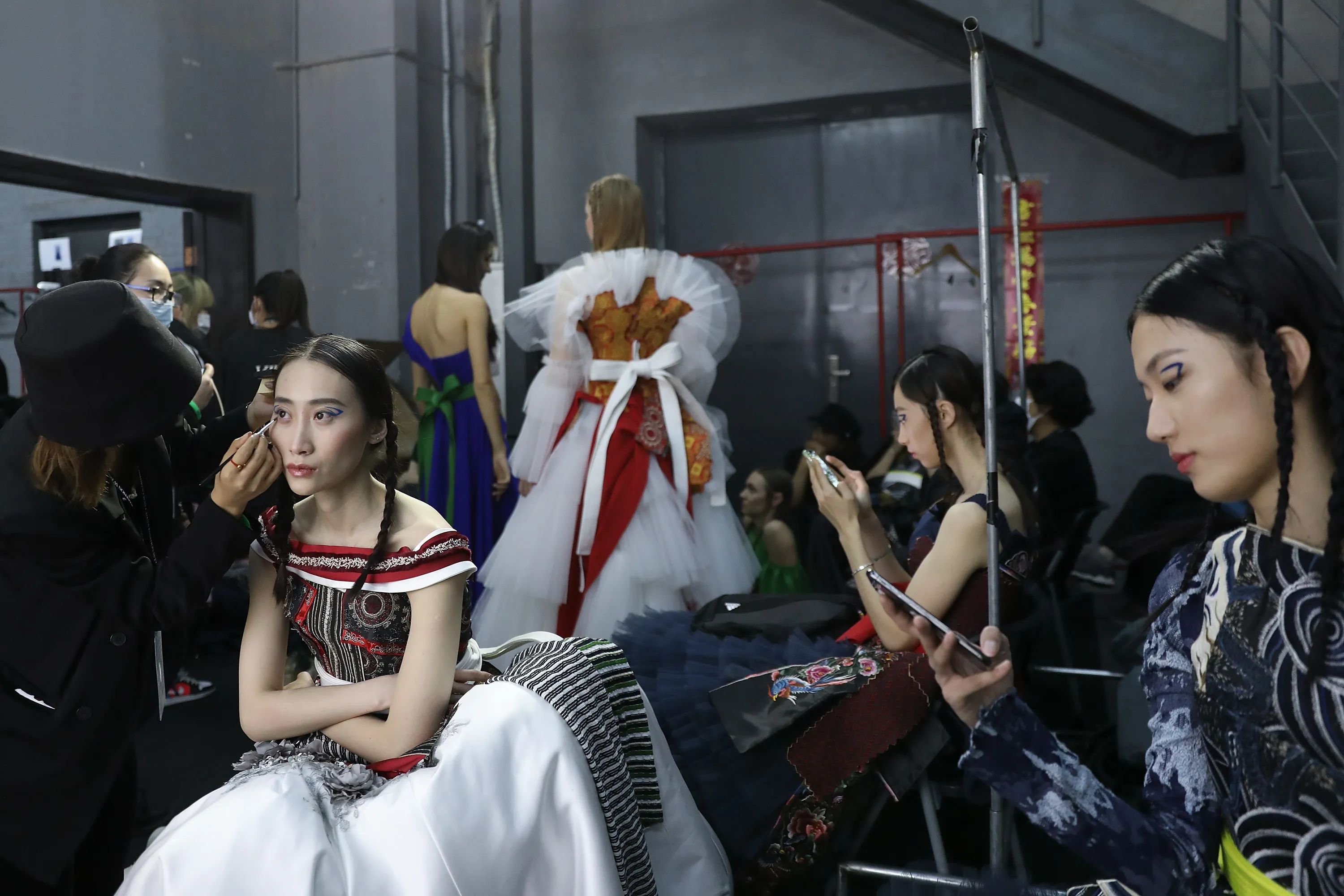 Models prepares backstage before during Dong Xiang Female Embroider collection show by Chinese designer Zhang Zhaoda on day two of China Fashion Week at 751D.PARK on October 25, 2020 in Beijing, China. (Photo by Lintao Zhang/Getty Images)
