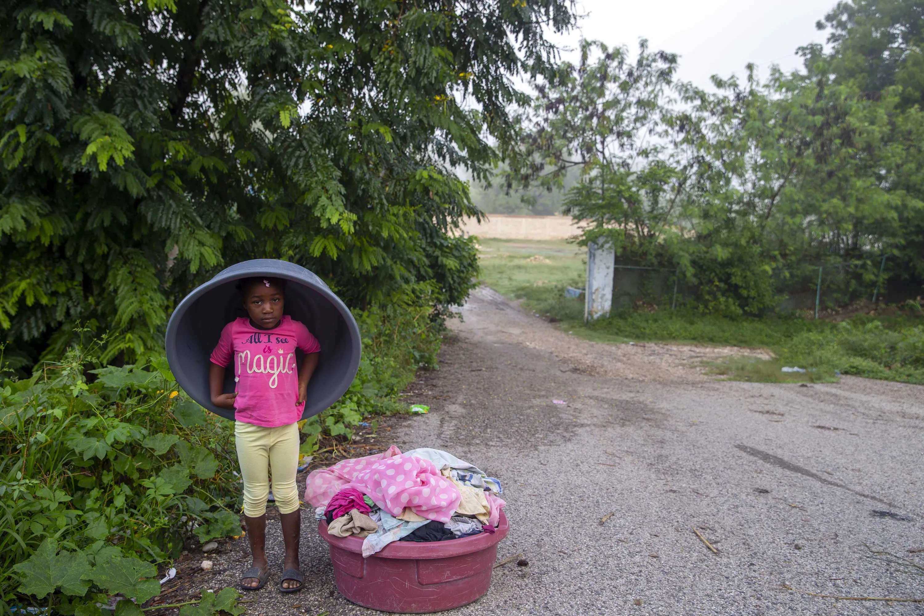Malaika Pierre, 5, waits for her mother to wash clothes in the Meille River, in front of the former UN base in Mirebalais, Haiti, Monday, October 19, 2020. (Photo by Dieu Nalio Chery/AP Photo)