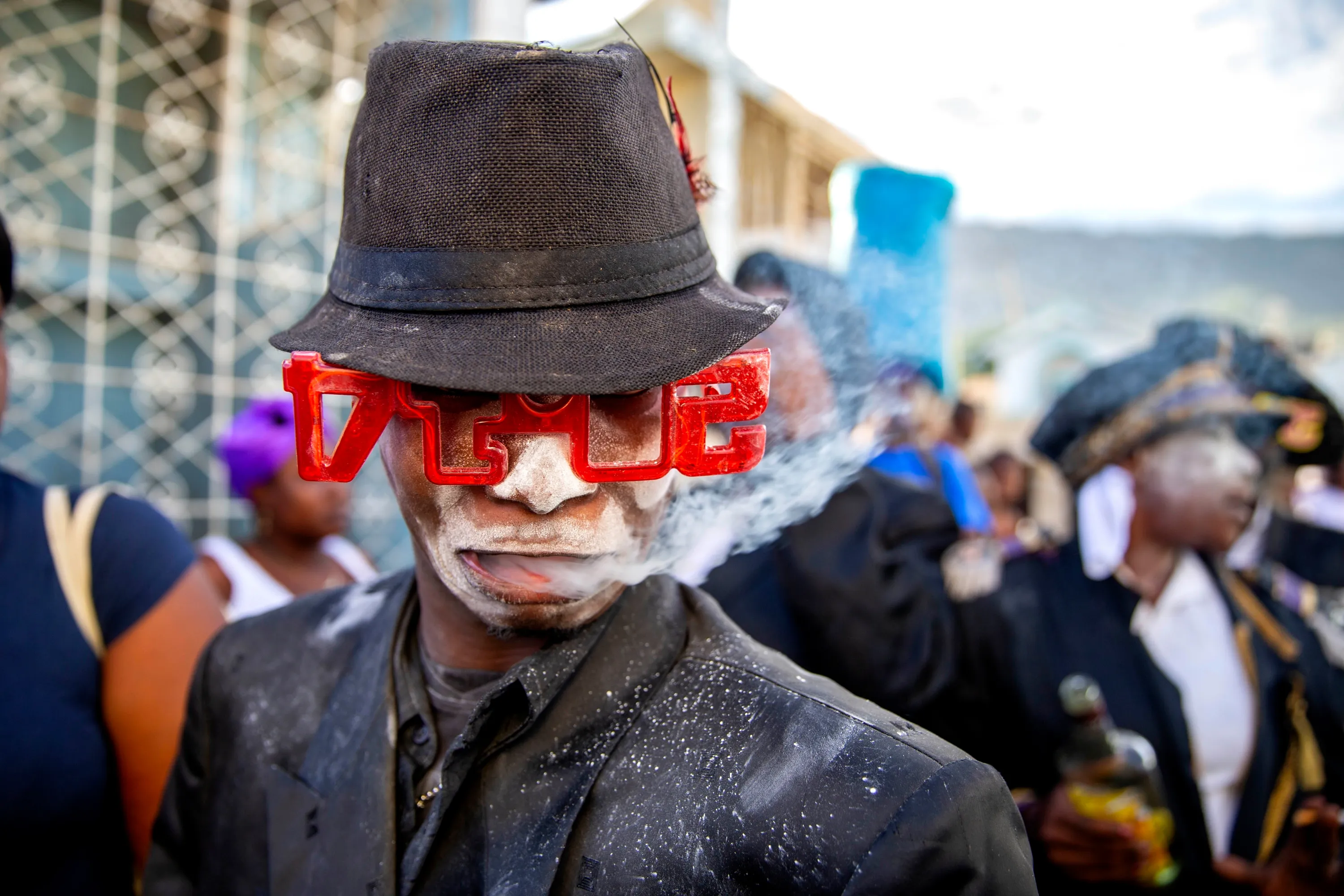 A man who is said to be possessed with the Gede spirit performs a ritual at the National Cemetery during ceremonies honoring the Haitian Voodoo spirit of Baron Samdi and Gede on the Day of the Dead in Port-au-Prince, Haiti, Sunday, November 1, 2020. Followers of Voodoo with their faces covered in white powder, wearing hats and dressed in black, white and purple clothes join the Fete Gede celebration of the spirits equivalent to the Roman Catholic festivity of the Day of the Dead and Day of All Saints. (Photo by Dieu Nalio Chery/AP Photo)