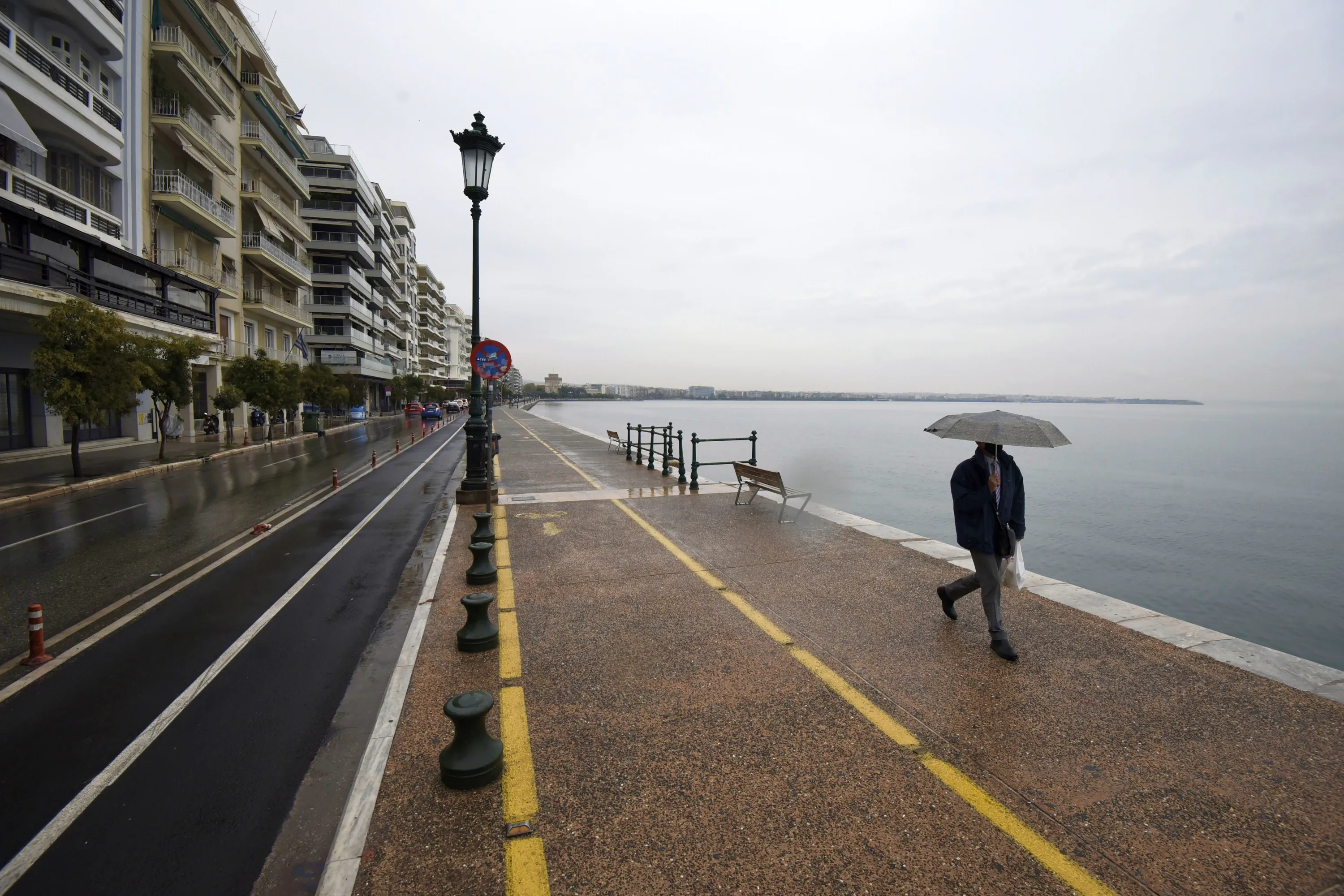 A pedestrian holds an umbrella as he walks on a coastal avenue during the lockdown to contain the spread of COVID-19 in the northern city of Thessaloniki, Greece, Tuesday, November 3, 2020. Greece's government imposed a localized lockdown on its second largest city of Thessaloniki and the northern province of Serres, after major increases in the number of coronavirus infections there. (Photo by Giannis Papanikos/AP Photo)
