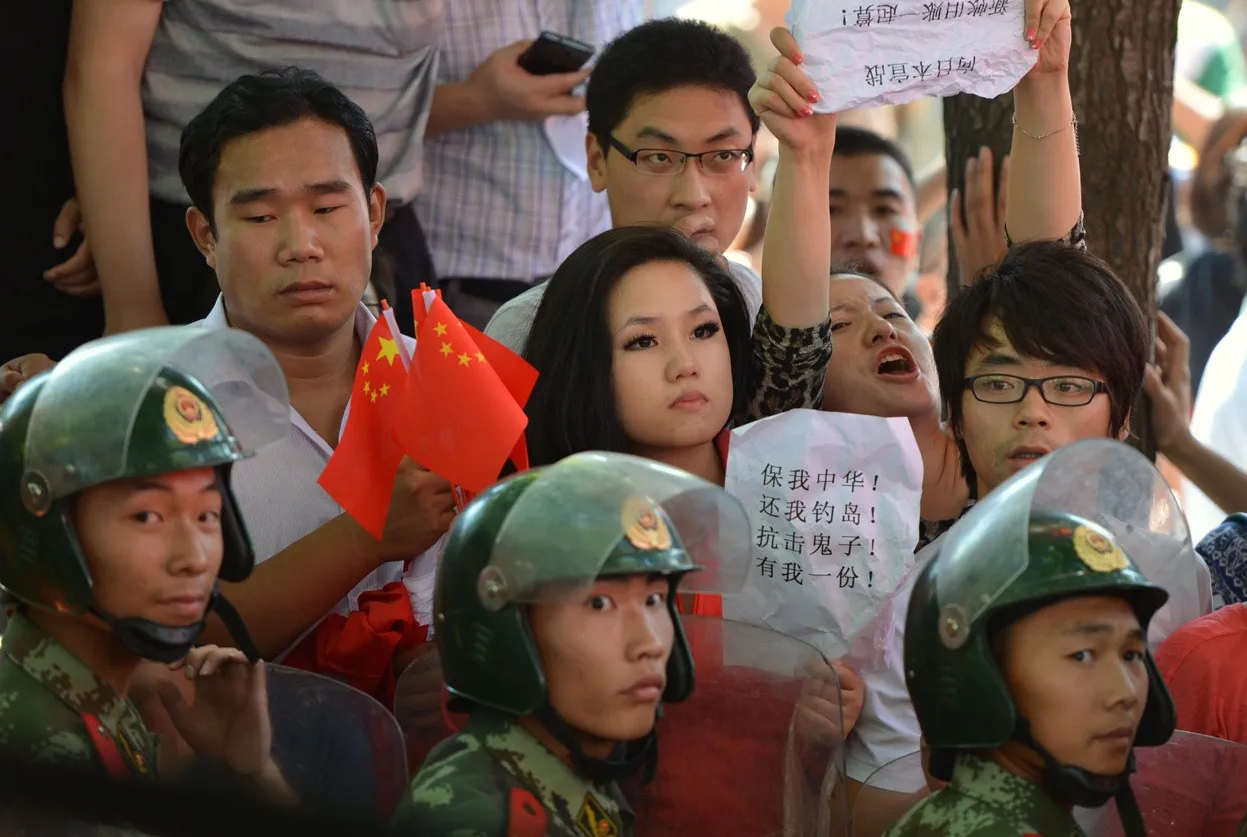 Officers stand guard as people shout slogans and hold Chinese flags during an anti-Japanese protest over the Diaoyu/Senkaku Islands, outside the Japanese embassy in Beijing, on September 15, 2012. Hundreds of people protested in front of the Japanese embassy in Beijing on Saturday amid rising tensions over disputed East China Sea islands as police struggled to quell the angry demonstration. (Photo by Mark Ralston/AFP)