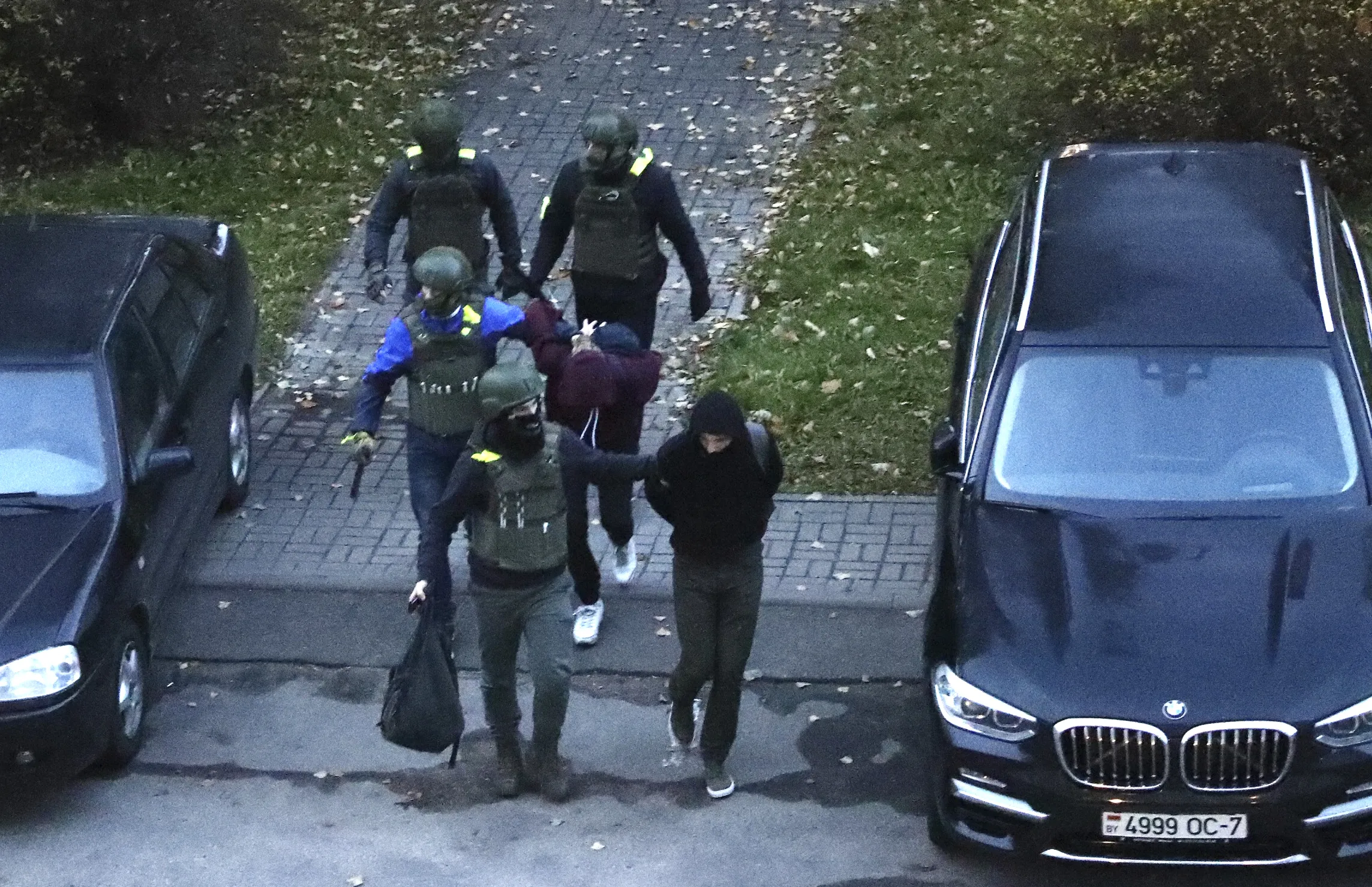 Police detain protesters after dispersing an opposition rally to protest the official presidential election results in Minsk, Belarus, Sunday, October 25, 2020. (Photo by AP Photo/Stringer)