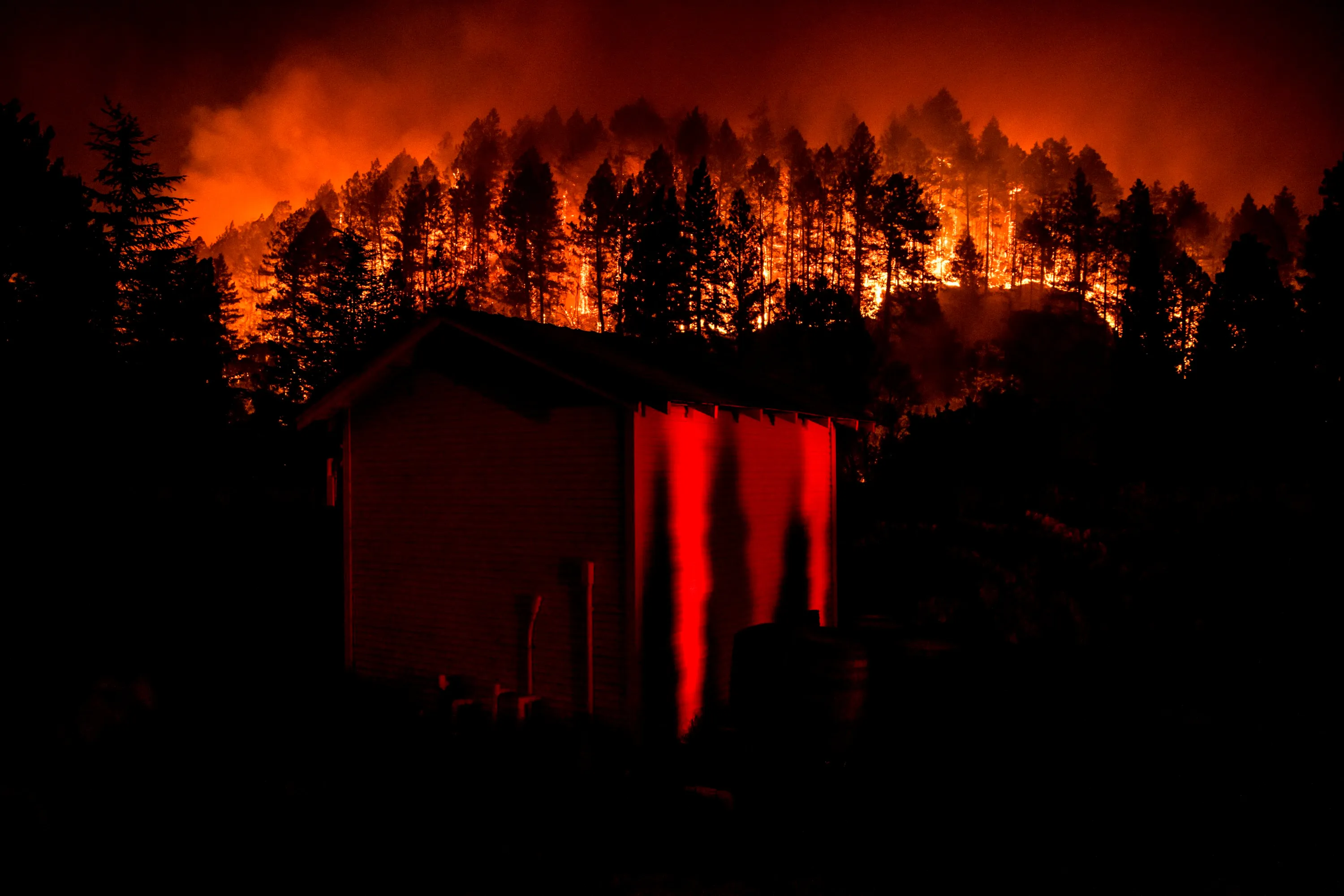 The Glass Fire begins it's descent into the valley after ravaging the hills as night falls on Napa Valley, California on September 27, 2020. The Glass fire grew to 2,500 Acres on the evening of September 27. A heat wave and dry winds create critical weather conditions and mandatory evacuations are in order. (Photo by Samuel Corum/AFP Photo)