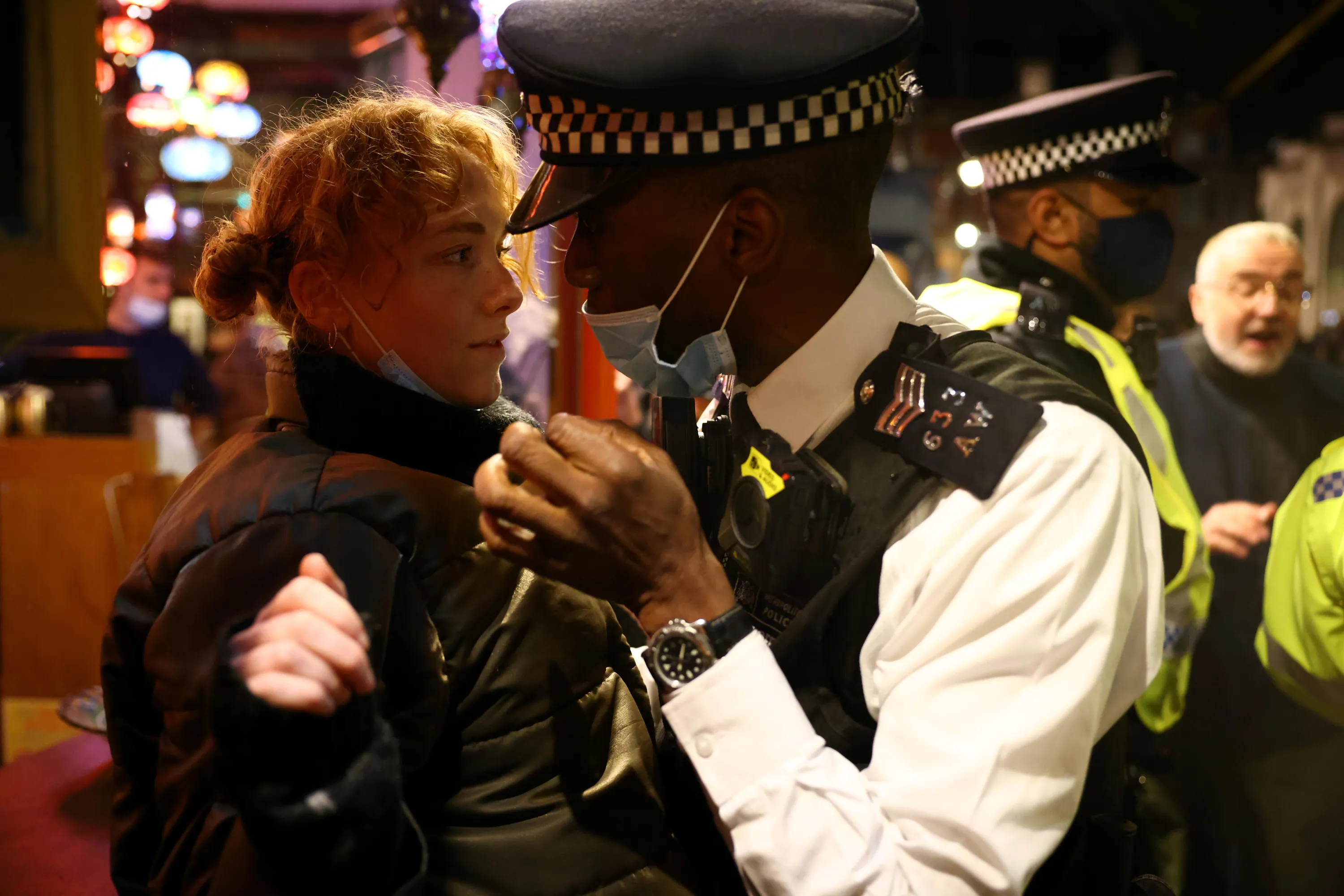 A police officer wearing a protective face mask speaks to a woman as pubs close ahead of the lockdown in Soho, London, Britain, November 4, 2020. (Photo by Henry Nicholls/Reuters)