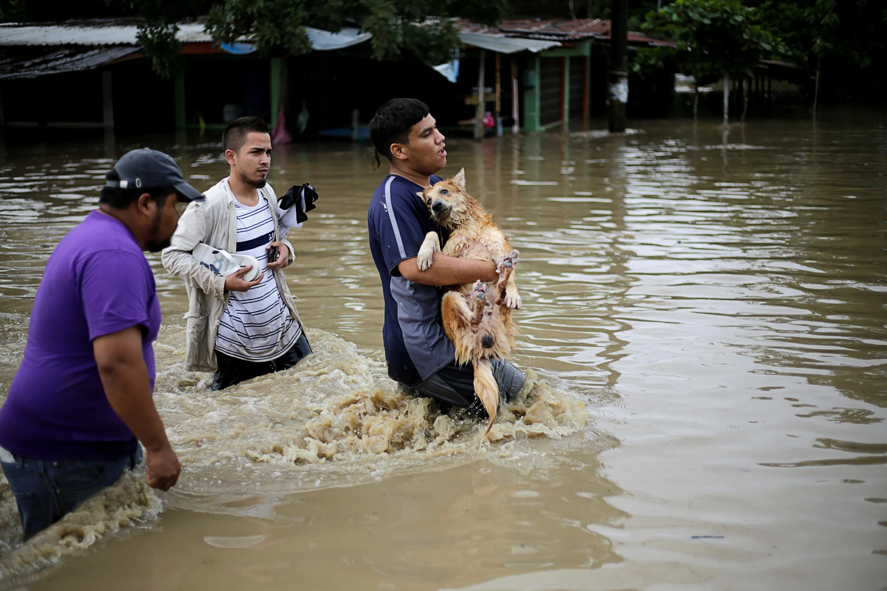 A man carries his dog as he walks with other people through a flooded street during the passage of Storm Eta, in La Lima, Honduras on November 5, 2020. (Photo by Jorge Cabrera/Reuters)