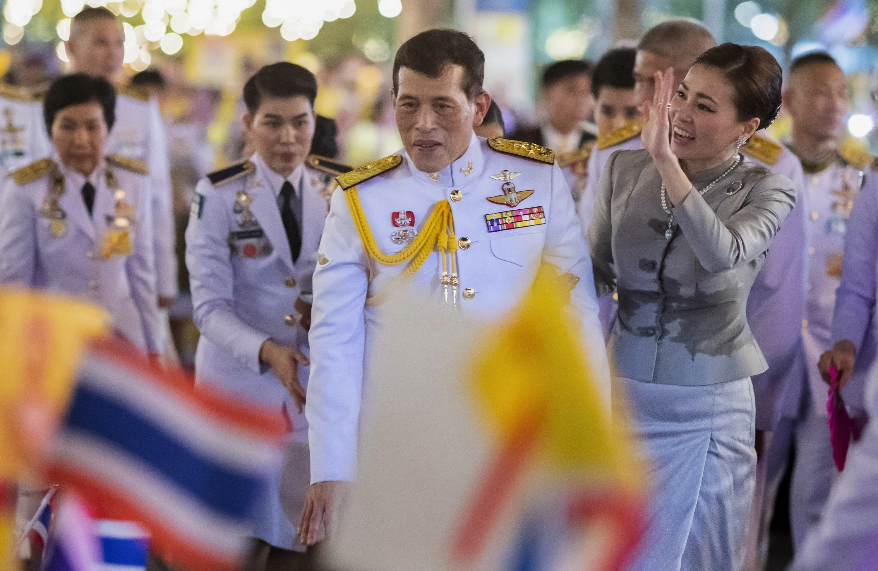 King Maha Vajiralongkorn, center left and Queen Suthida, center right wave to supporters in Bangkok, Thailand, Sunday, November 1, 2020. (Photo by Wason Wanichakorn/AP Photo)