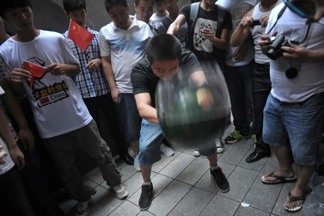 A protester throws a police helmet to the ground as fellow demonstrators take pictures during an anti-Japan protest in Guangzhou, Guangdong province, on September 16, 2012. (Photo by Reuters/Stringer)