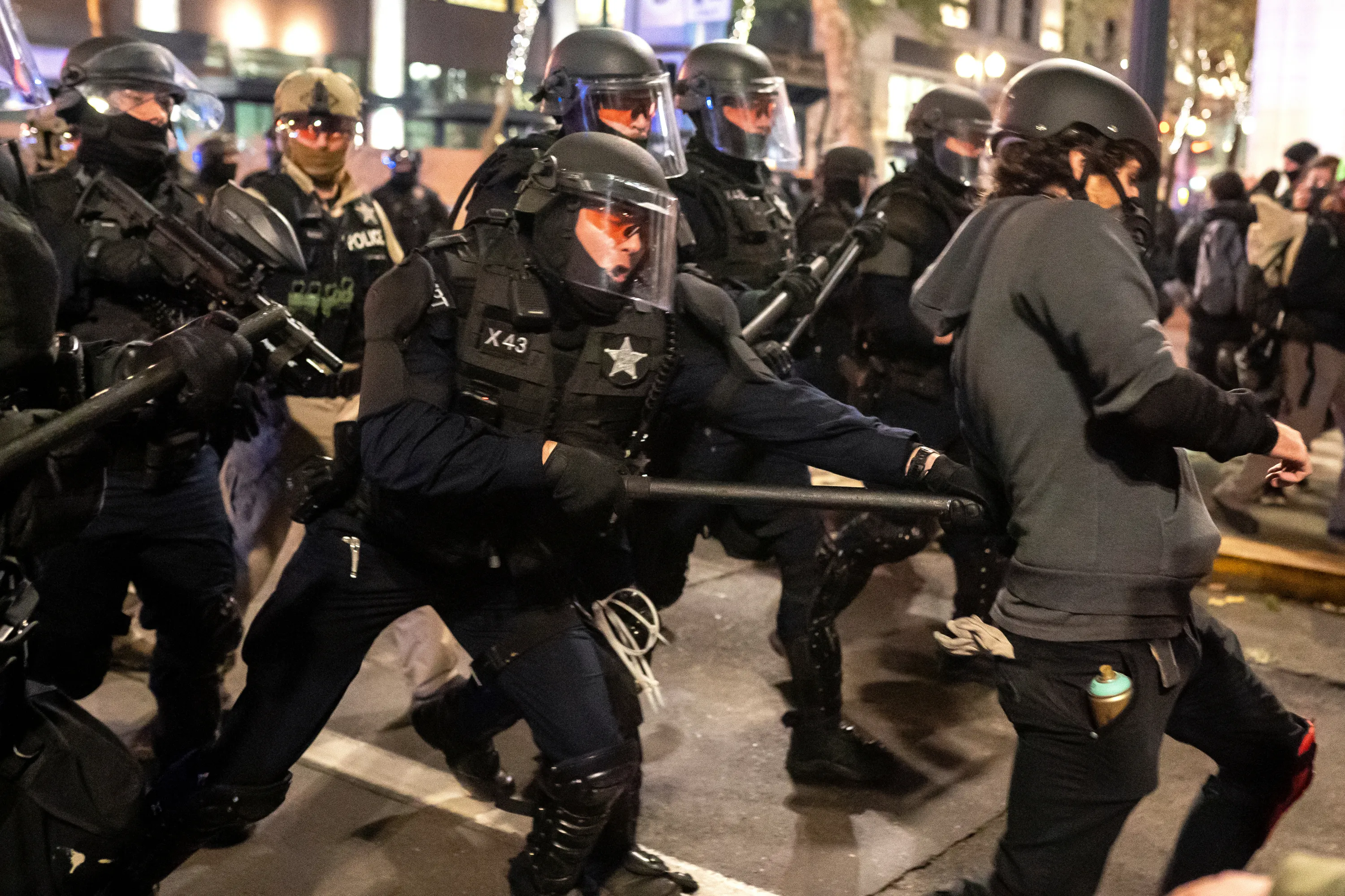 An Oregon State Trooper hits a protester with his baton while dispersing a crowd of black bloc protesters on November 4, 2020 in Portland, Oregon. Multiple protests, some peaceful and others violent, broke out in Portland as the presidential election remained undecided. (Photo by Nathan Howard/Getty Images)
