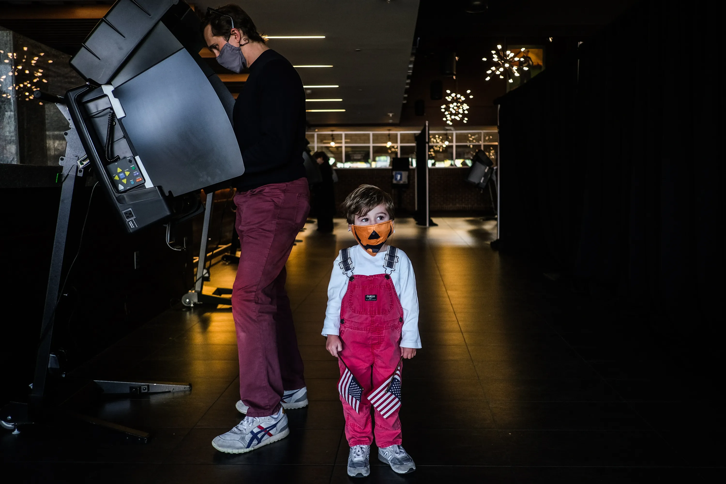 A young boy holding two american flags as his father votes inside a polling location at Nationals Park, in Washington, DC, USA, 03 November 2020. Americans vote on Election Day to choose between re-electing Donald J. Trump or electing Joe Biden as the 46th President of the United States to serve from 2021 through 2024. (Photo by Mario Cruz/EPA/EFE)