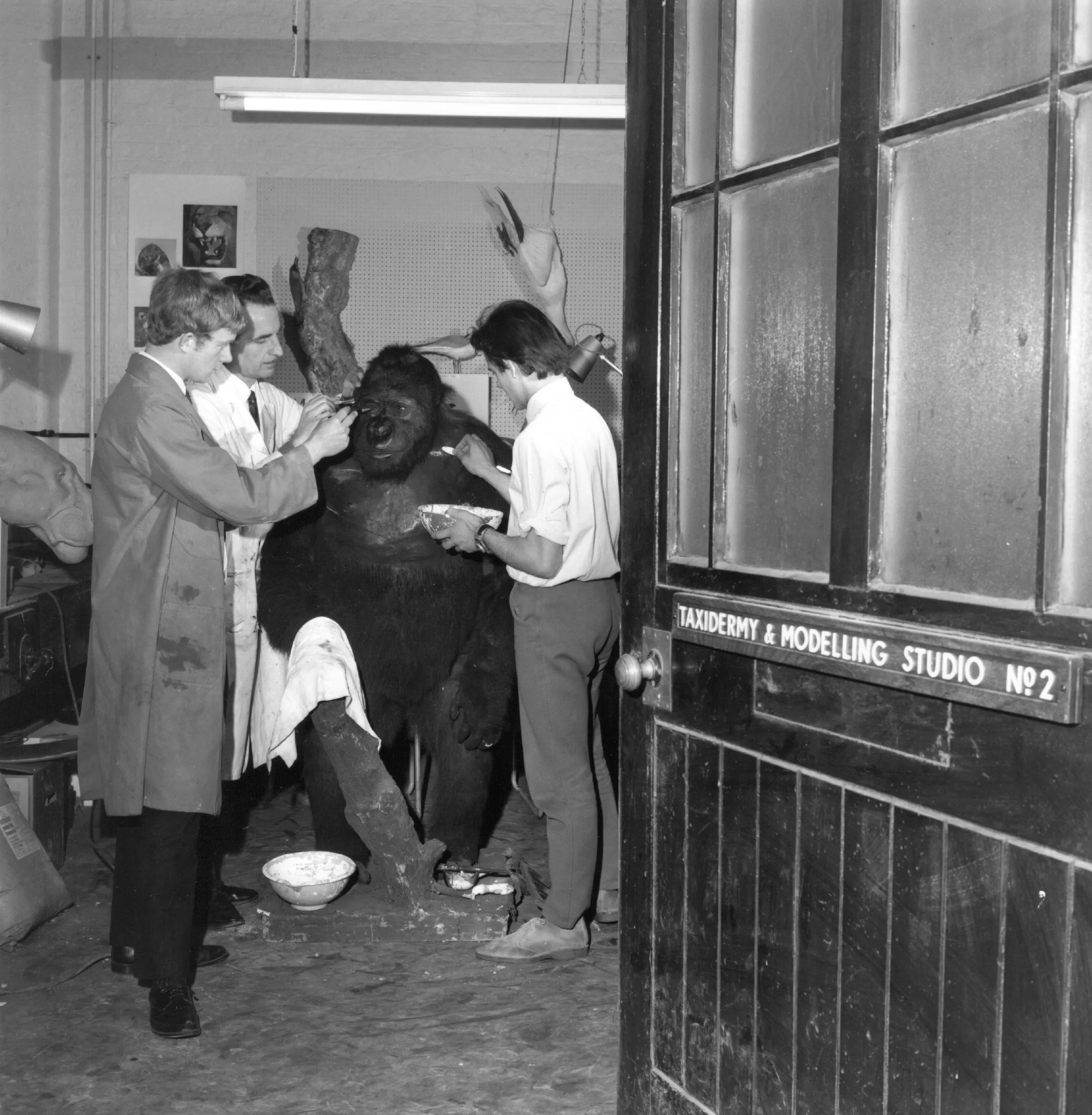 Taxidermists at work stuffing a gorilla at the Natural History Museum in London, 1968. (Photo by Chris Ware/Keystone Features)