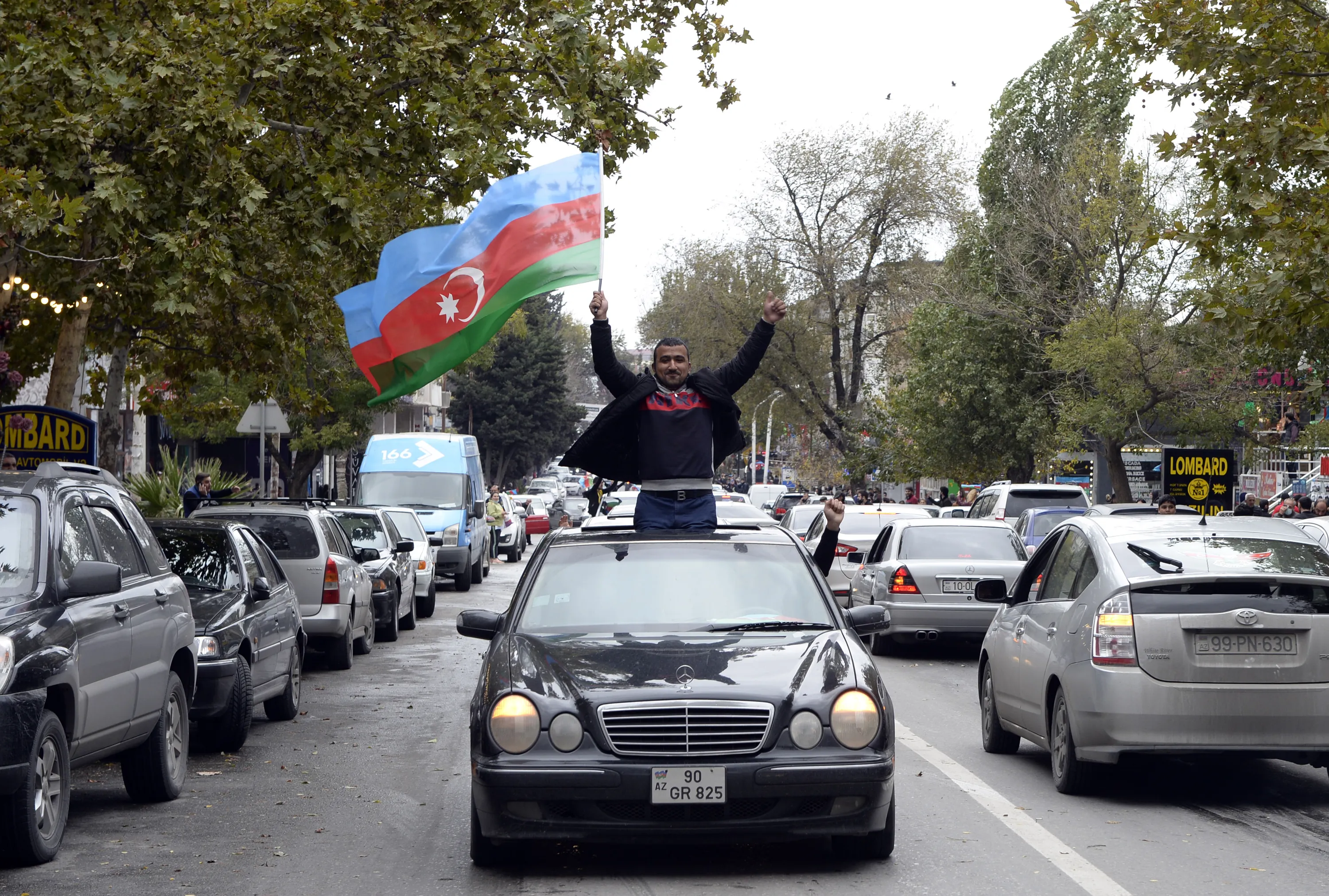 A man holds Azeri flag as he celebrates the capture the town of Shusha in Baku on November 8, 2020, during the ongoing military conflict between Armenia and Azerbaijan over the breakaway region of Nagorno-Karabakh. Azerbaijani President said on November 8 that his country's forces had captured the town of Shusha in Nagorno-Karabakh, in what would be a major strategic victory over the region's Armenian separatists. (Photo by Tofik Babayev/AFP Photo)