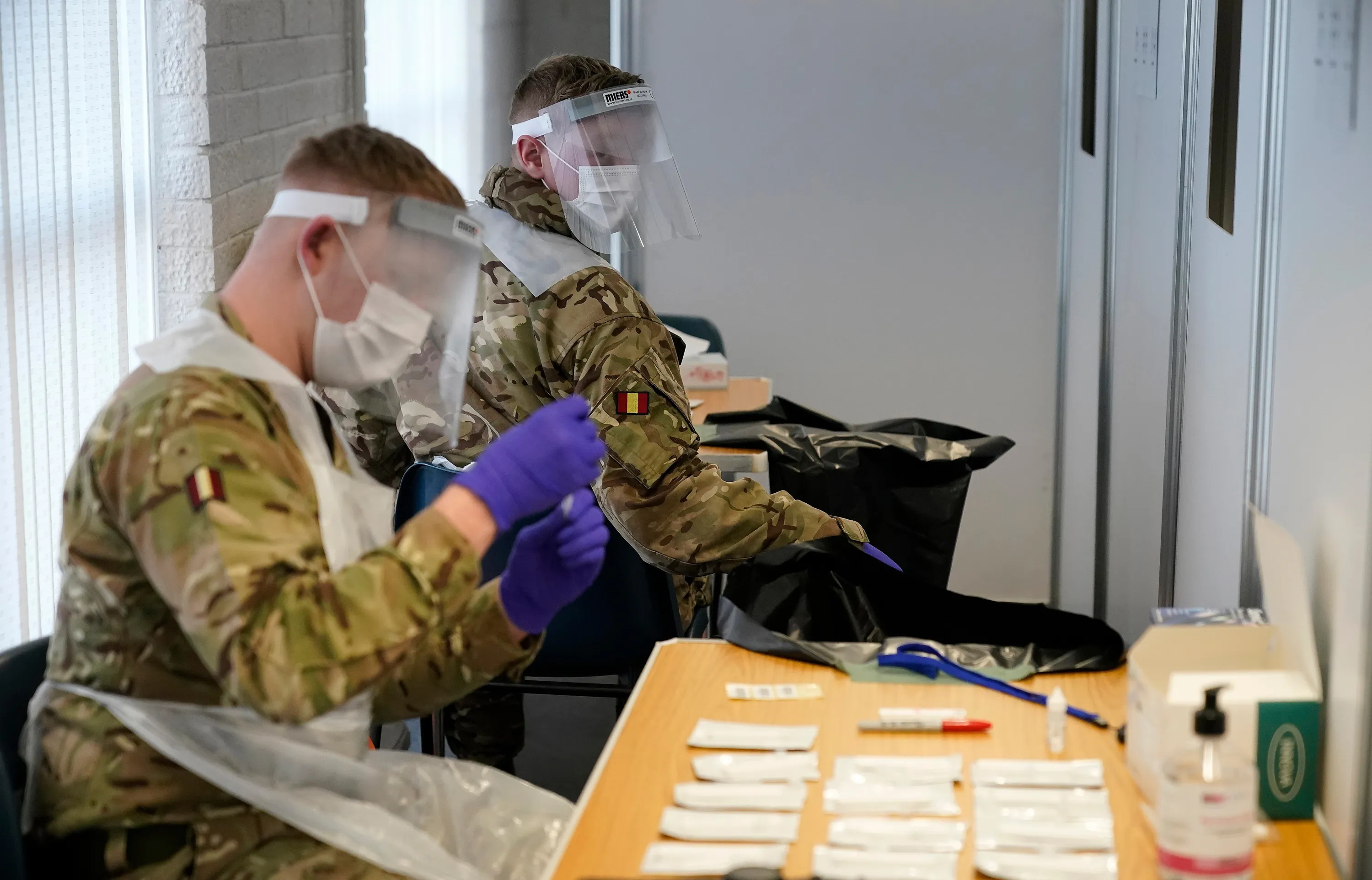 Troopers from The King's Royal Hussars, who normally crew main battle tanks, conduct coronavirus (Covid-19) Flow tests on members of the public at a testing centre set up at Aintree Baptist Church on November 07, 2020 in Liverpool, England. The government are offering all Liverpool residents quick- result tests to identify who has COVID-19 and asking them to isolate. If this technology is successful it could lead to an end to lockdowns as a method to combat the COVID-19 Pandemic. (Photo by Christopher Furlong/Getty Images)
