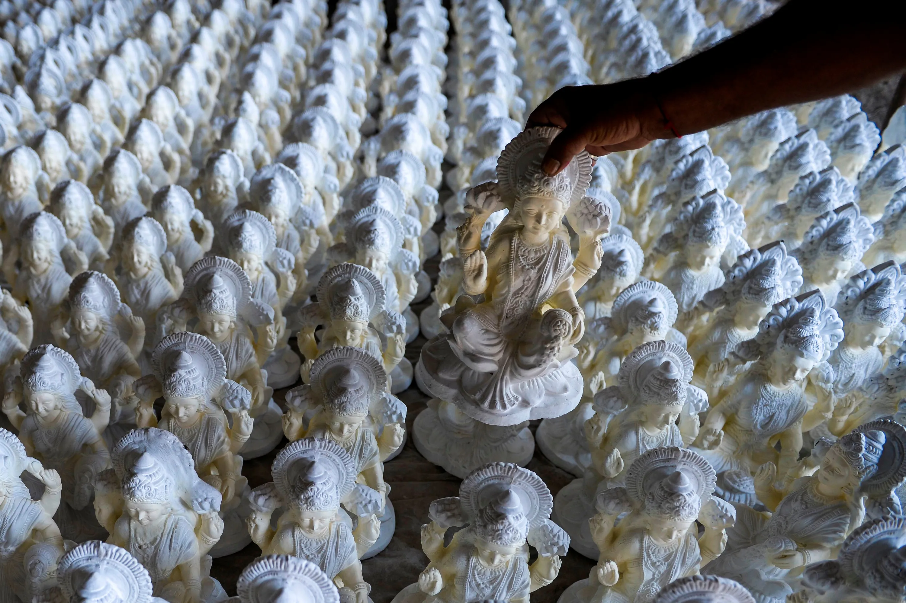 An artisan picks up a statue of the Hindu goddess Lakshmi to paint in a workshop ahead of Diwali, the Hindu festival of lights, in Hyderabad on November 5, 2020. (Photo by Noah Seelam/AFP Photo)