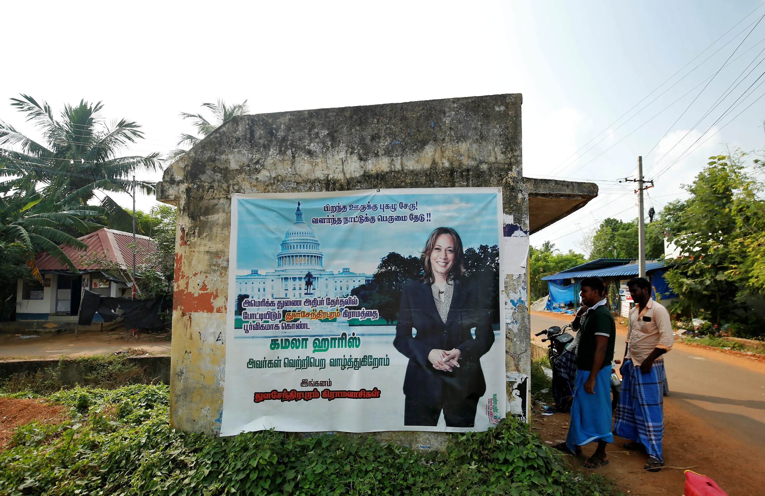 A banner featuring U.S. Democratic vice presidential nominee Kamala Harris is seen pasted on a wall at a bus stop at the village of Thulasendrapuram, where Harris' maternal grandfather was born and grew up, in Tamil Nadu, India, November 4, 2020. (Photo by P. Ravikumar/Reuters)