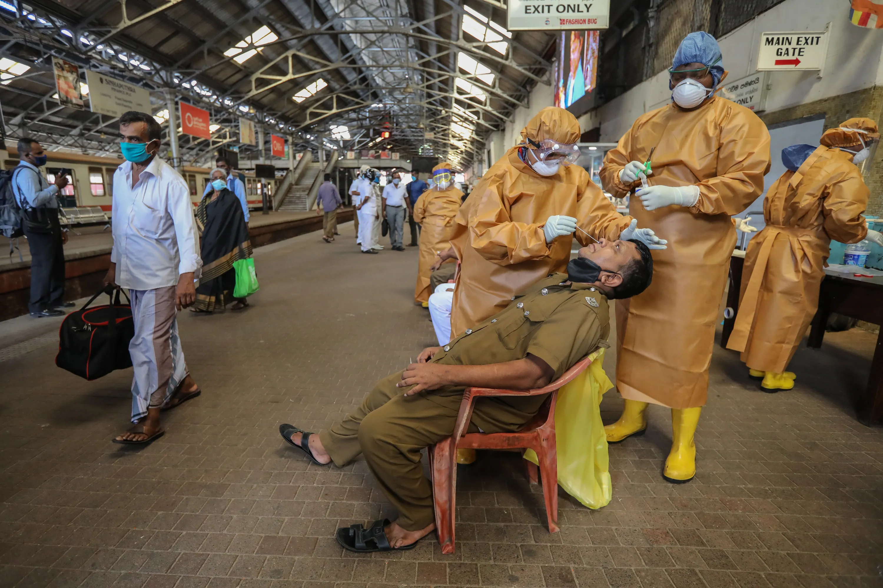 Commuters undergo COVID-19 swab tests at the fort main railway station amid of the coronavirus pandemic in Colombo, Sri Lanka, 12 October 2020. Sri Lankan government implement a curfew in some parts of the country due to a sudden spike of the Covid-19 cluster from a textiles factory in the Gampaha District. (Photo by Chamila Karunarathne/EPA/EFE)