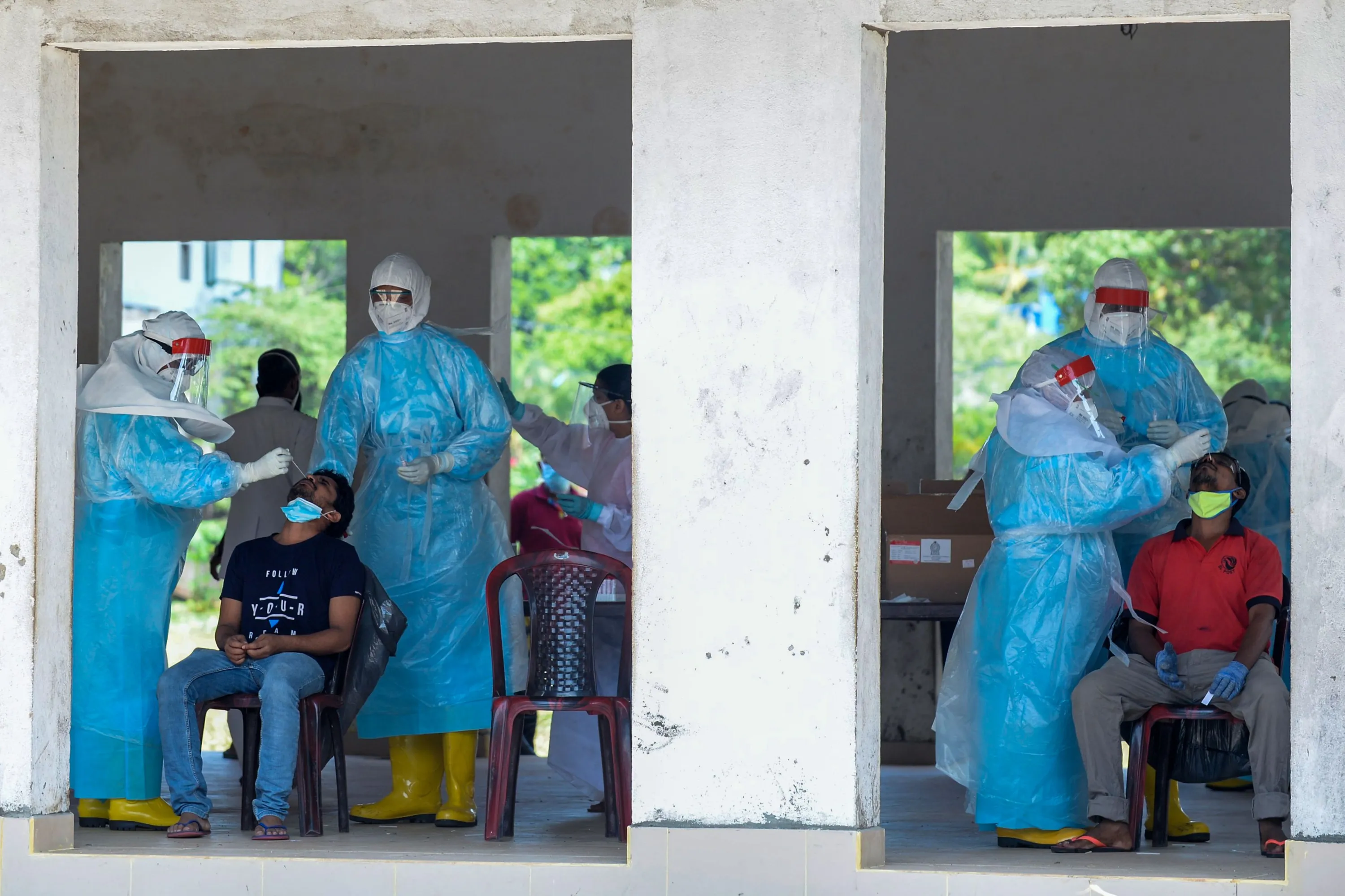 Medical workers collect swab samples from residents to test for the COVID-19 coronavirus in Colombo on November 5, 2020. (Photo by Lakruwan Wanniarachchi/AFP Photo)