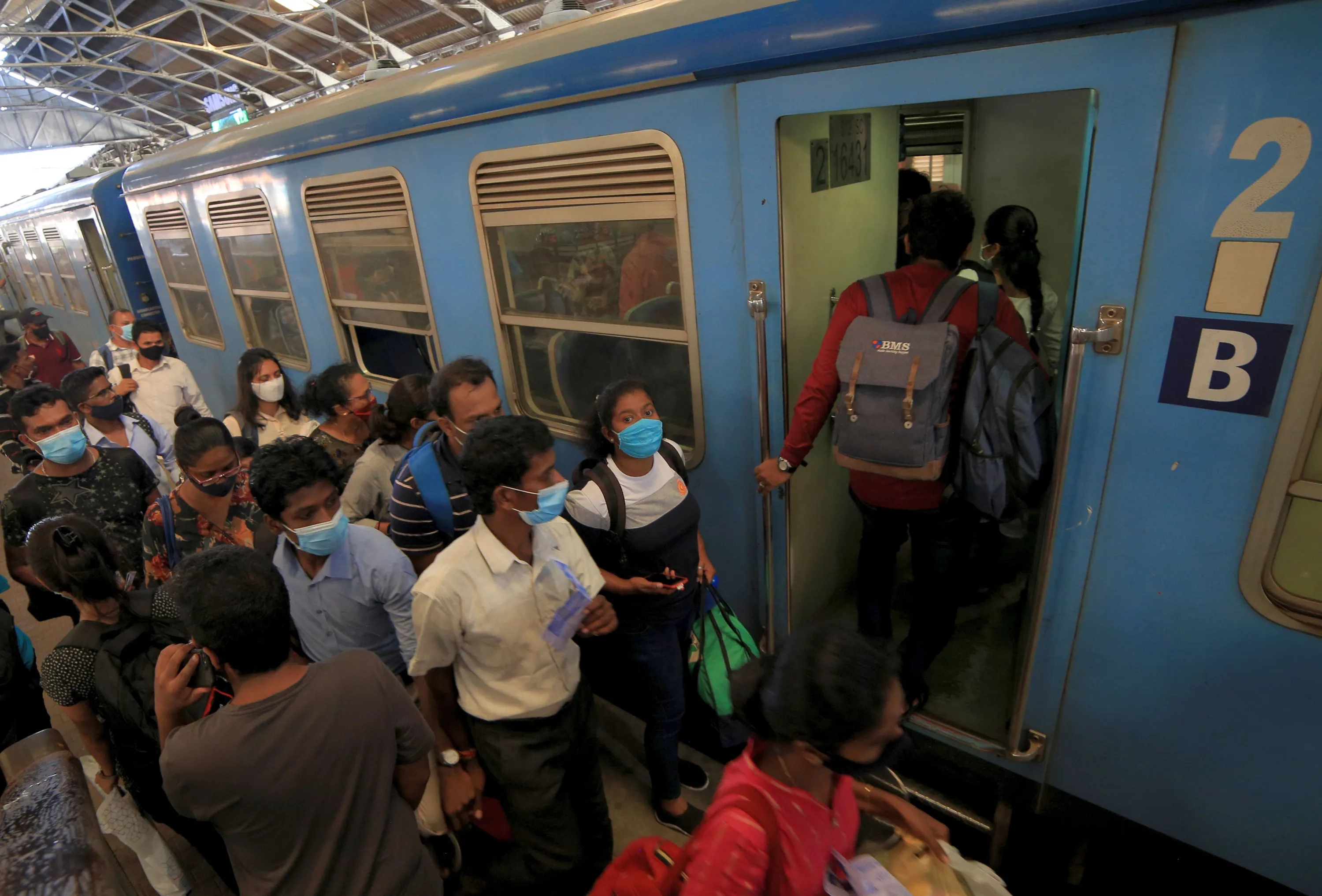 Sri Lankan commuters wearing face masks wait to get in to the train at the Fort Railway Station, Colombo, Sri Lanka, on October 05, 2020. Sri Lankan authorities closed schools countrywide and imposed a curfew on Sunday in three suburbs in Western Province, after a person tested positive for the coronavius following which 81 new Covid19 positive cases were reported so far today (05) in Sri Lanka. (Photo by Tharaka Basnayaka/NurPhoto via Getty Images)