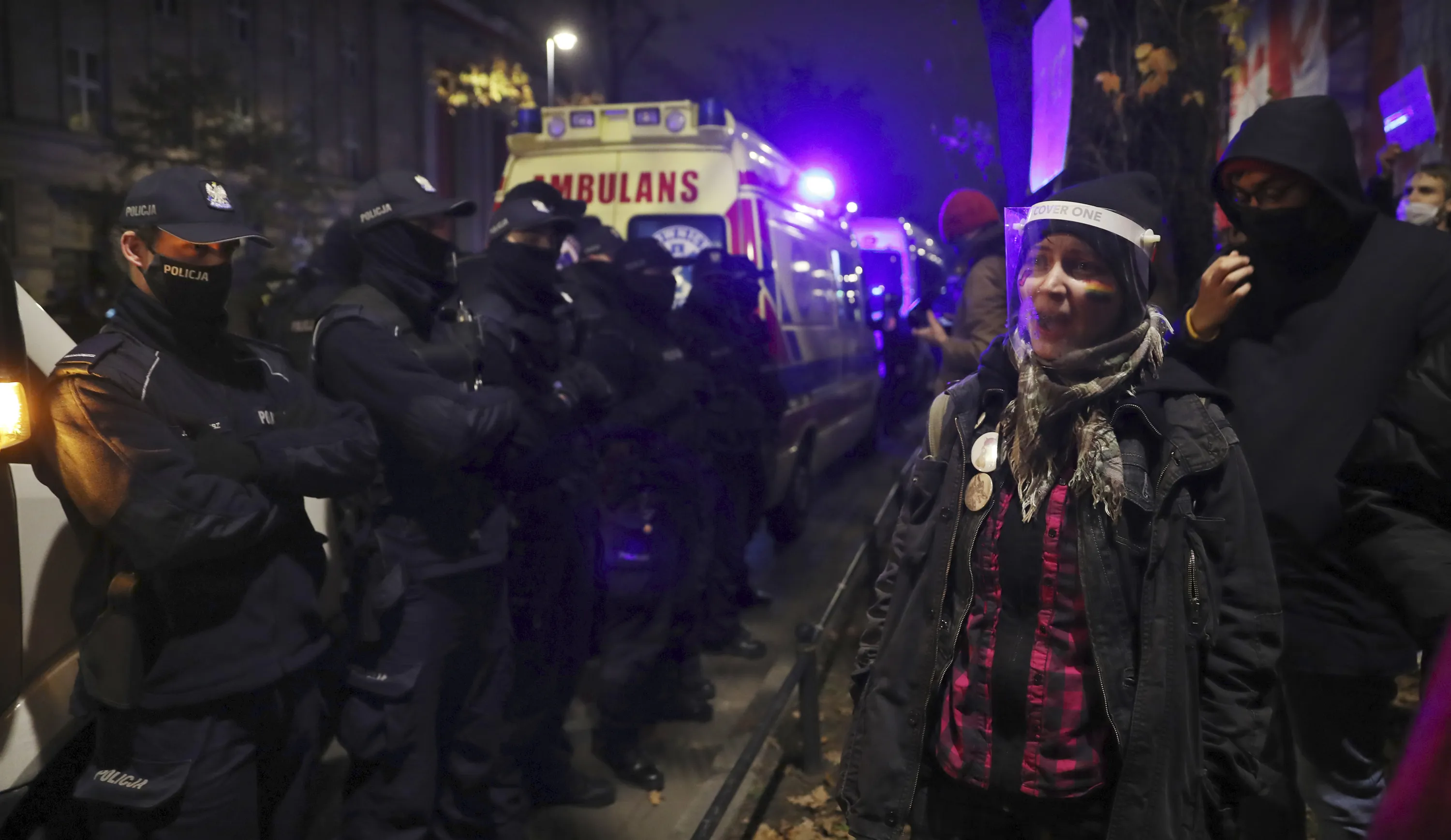 Protesters blocking a street outside the Education Ministry demand the firing of the new minister in the right-wing government, who has made a number of unpopular statements, in Warsaw, Poland, on Monday, November 9, 2020. The protest is part of a wave of nationwide anti-government protests that have been held daily ever since Oct.22 when a top court ruled to further tighten one of Europe's strictest abortion laws. (Photo by Czarek Sokolowski/AP Photo)