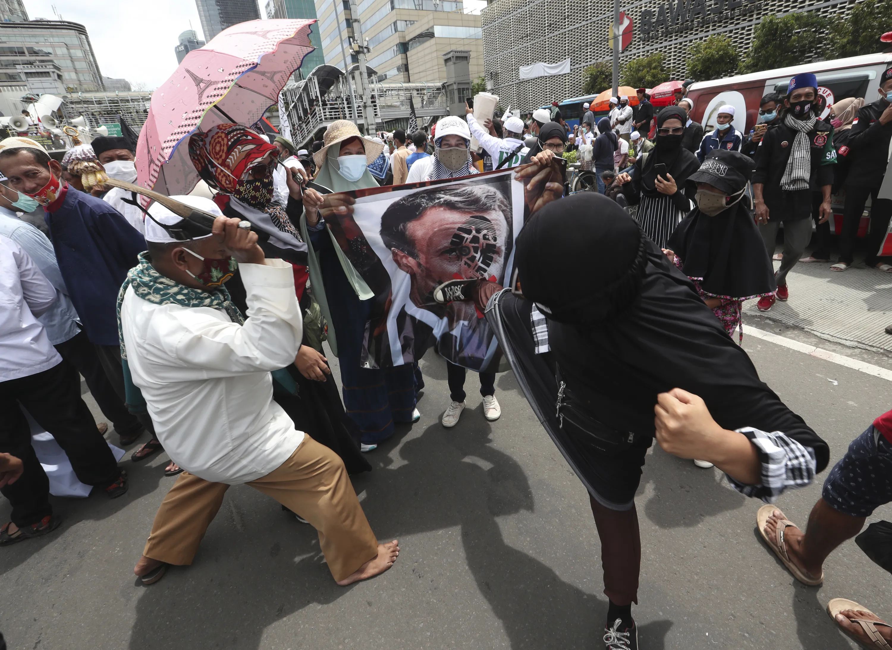 An Indonesian Muslim protester kicks a defaced poster of French President Emmanuel Macron during an anti-France rally outside the French embassy in Jakarta, Indonesia, Monday, November 2, 2020. Indonesian Muslims marched to the heavily guarded France Embassy in Indonesia's capital on Monday to protest France's president and his staunch support of secular laws that deem caricatures depicting the Prophet Muhammad as protected speech.(Photo by Achmad Ibrahim/AP Photo)