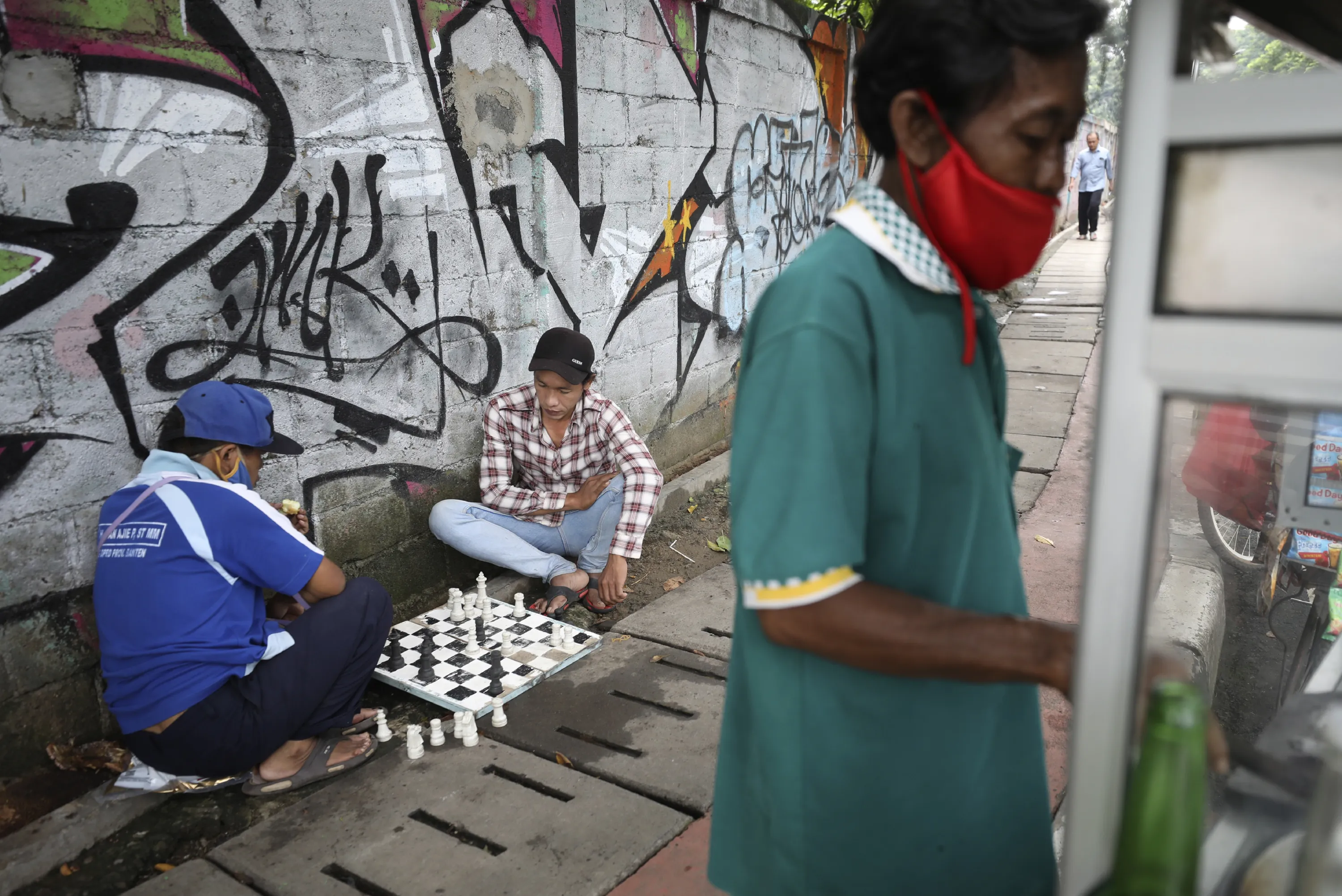 Men play chess on a sidewalk as a food vendor serves customers in Jakarta, Indonesia, Thursday, November 5, 2020. (Photo by Dita Alangkara/AP Photo)