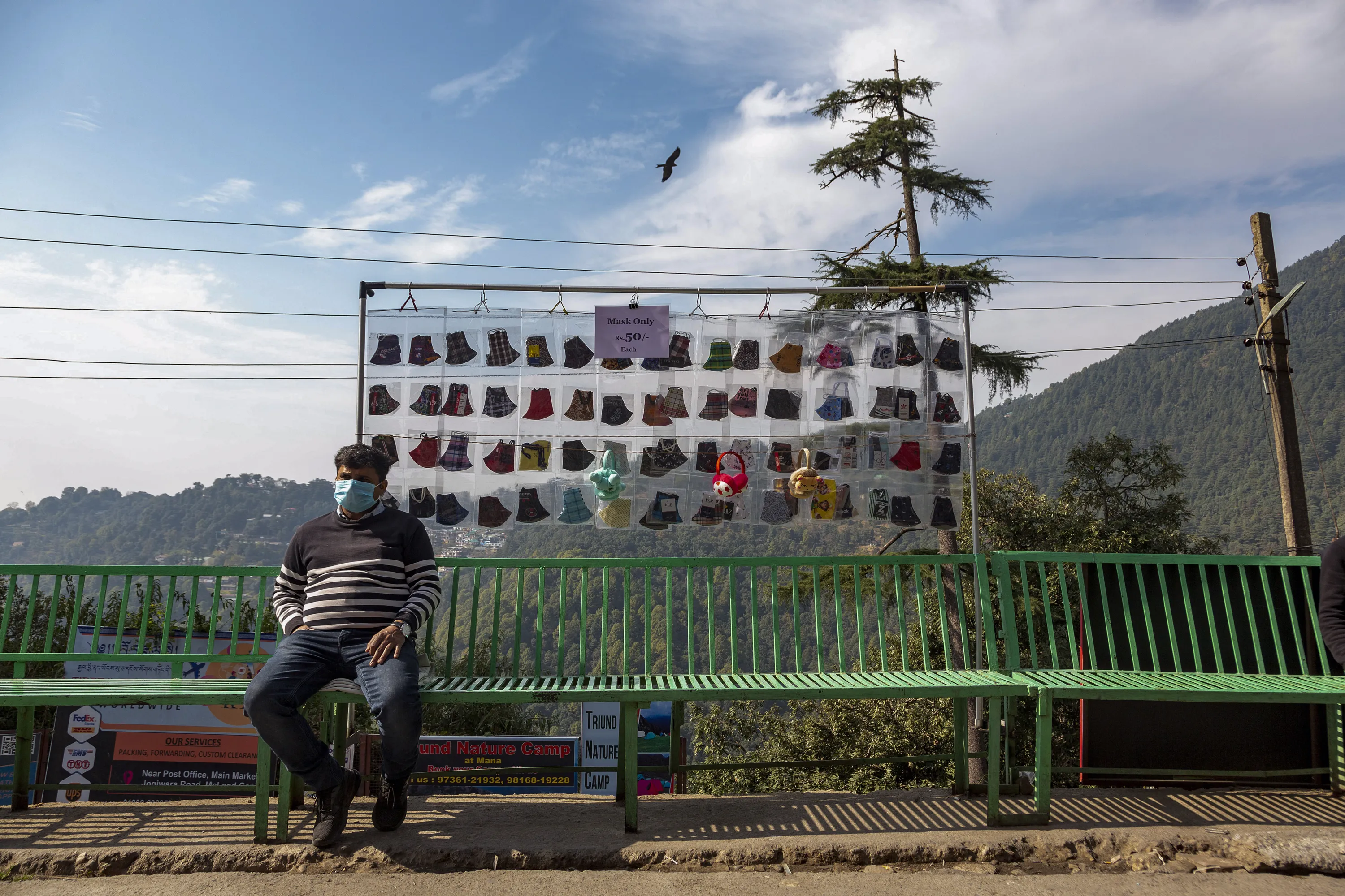 A man wearing a mask to protect himself from the coronavirus sits next to a display of face masks outside his shop in Dharmsala, India, Tuesday, November 10, 2020. India’s tally of confirmed coronavirus cases, the second largest in the world behind the United States, stands at more than 8.5 million. (Photo by Ashwini Bhatia/AP Photo)