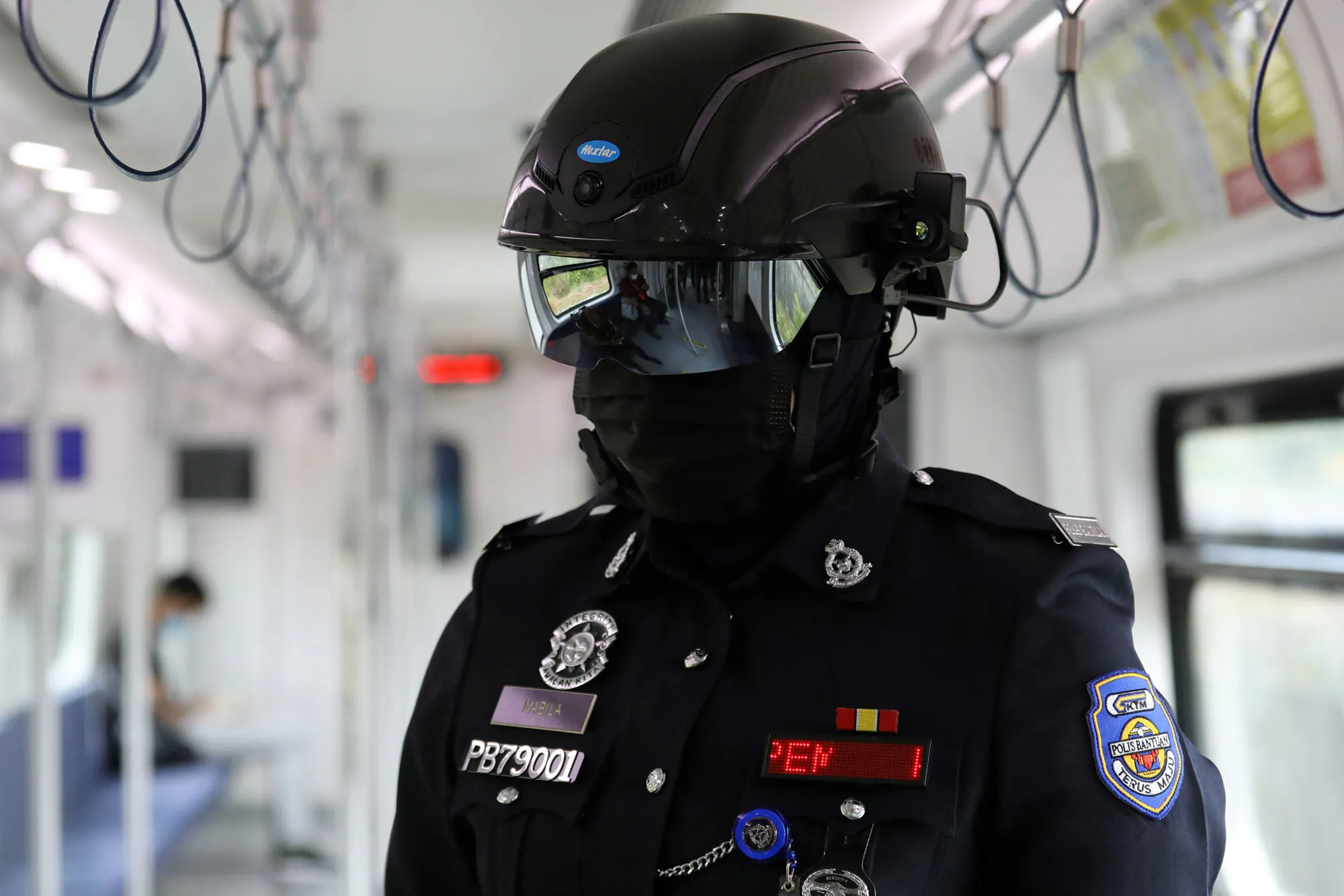 An auxiliary police officer wearing 'Smart Helmet', a portable thermoscanner that can measure the temperature of passengers at a distance, patrols inside a commuter train, amid the coronavirus disease (COVID-19) outbreak in Kuala Lumpur, Malaysia on October 14, 2020. (Photo by Lim Huey Teng/Reuters)