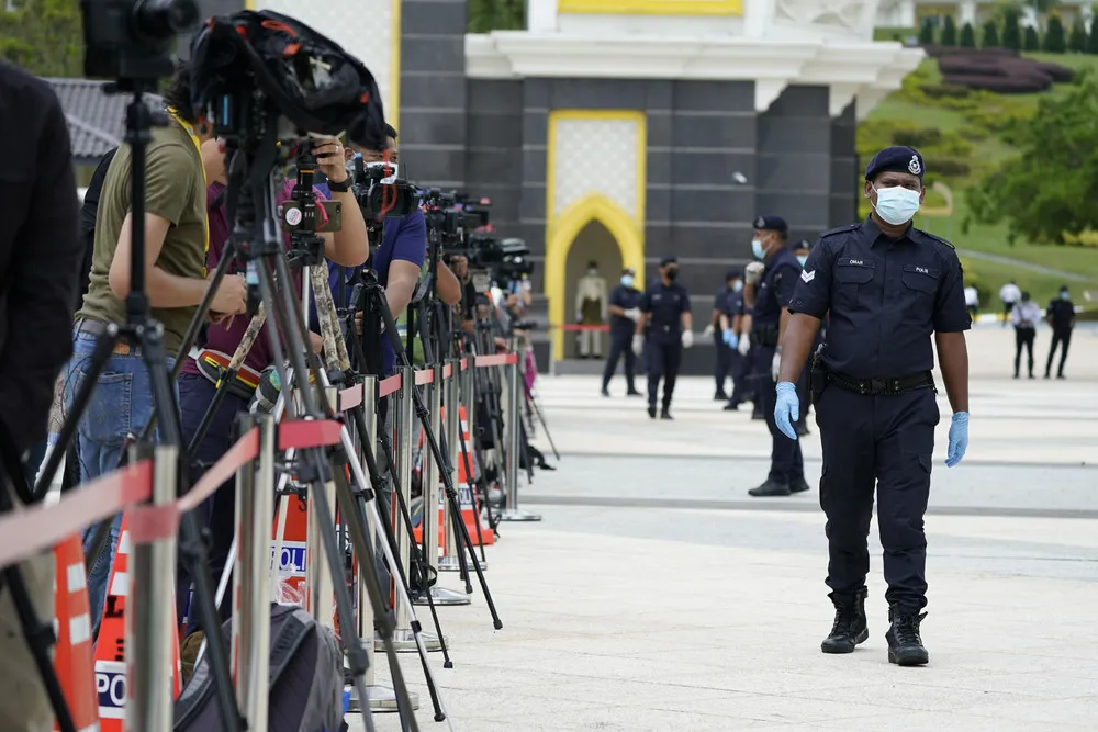 Police wearing a face mask to help curb the spread of the coronavirus guard media outside National Palace in Kuala Lumpur, Malaysia, Sunday, October 25, 2020. Malay rulers hold a special meeting on Sunday to discuss the government's plan to declare an emergency to tackle the worsening COVID-19 situation. (Photo by Vincent Thian/AP Photo)