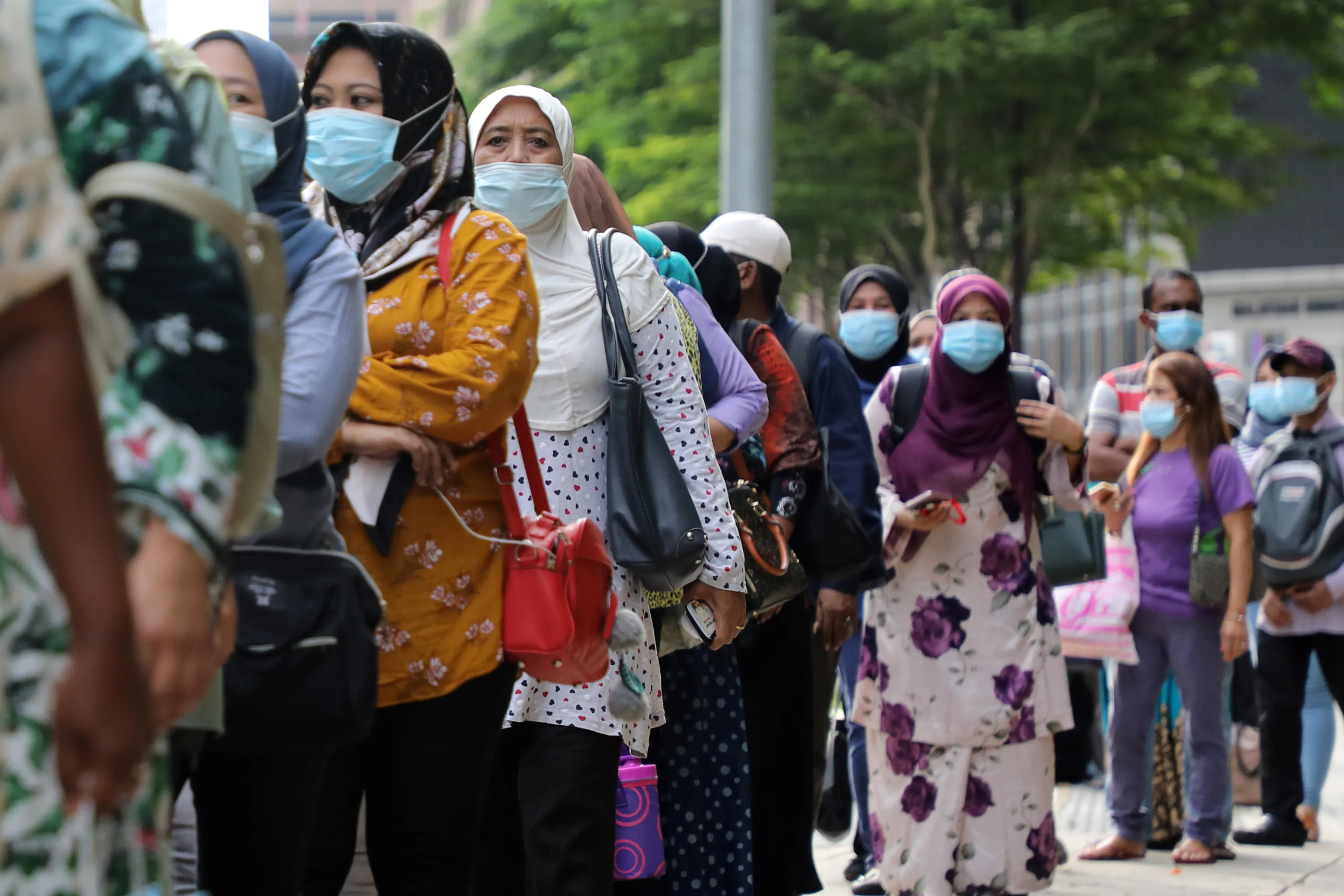 Passengers wearing protective masks wait in line to board a bus at a bus station, amid the coronavirus disease (COVID-19) outbreak in Kuala Lumpur, Malaysia on October 2, 2020. (Photo by Lim Huey Teng/Reuters)