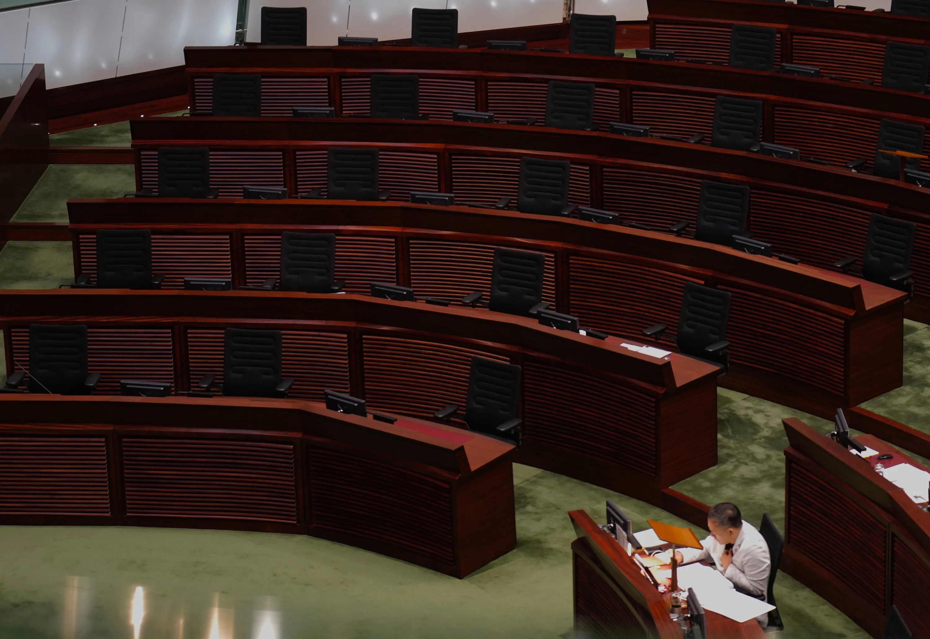 Empty seats of pro-democracy legislators are seen at Legislative Chamber in Hong Kong, Thursday, November 12, 2020. Hong Kong's legislature opened Thursday ahead of the planned mass resignation of its pro-democracy bloc, one day after the government ousted four of its members. (Photo by Vincent Yu/AP Photo)