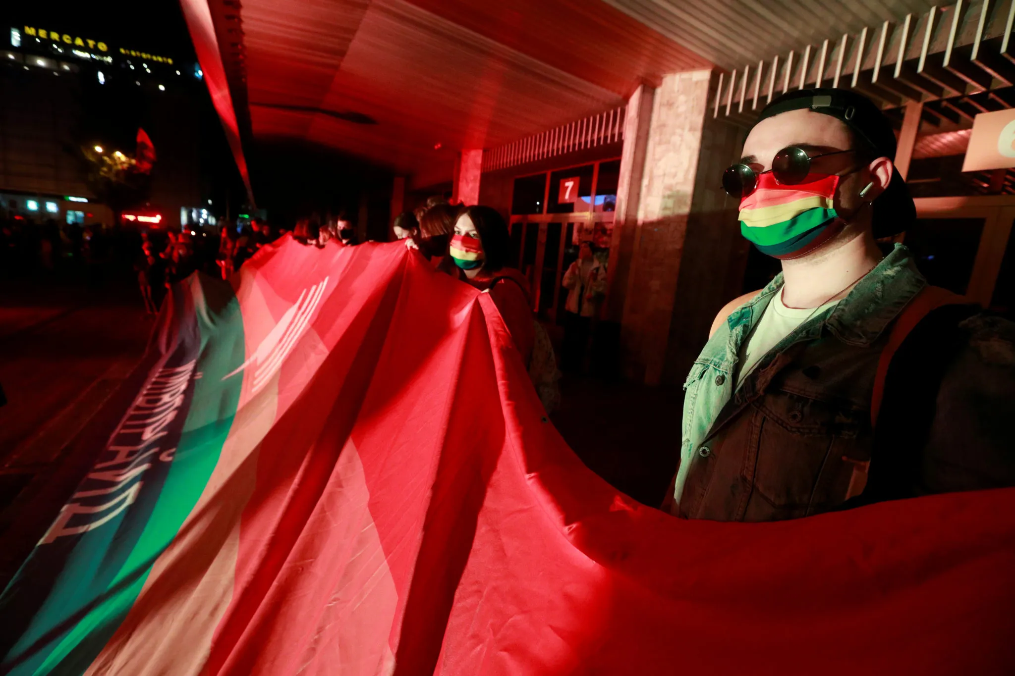 Participants wearing protective face masks hold a rainbow flag during a rally organized by the LGBT community to mark International Coming Out Day in Kyiv, Ukraine on October 11, 2020. (Photo by Valentyn Ogirenko/Reuters)