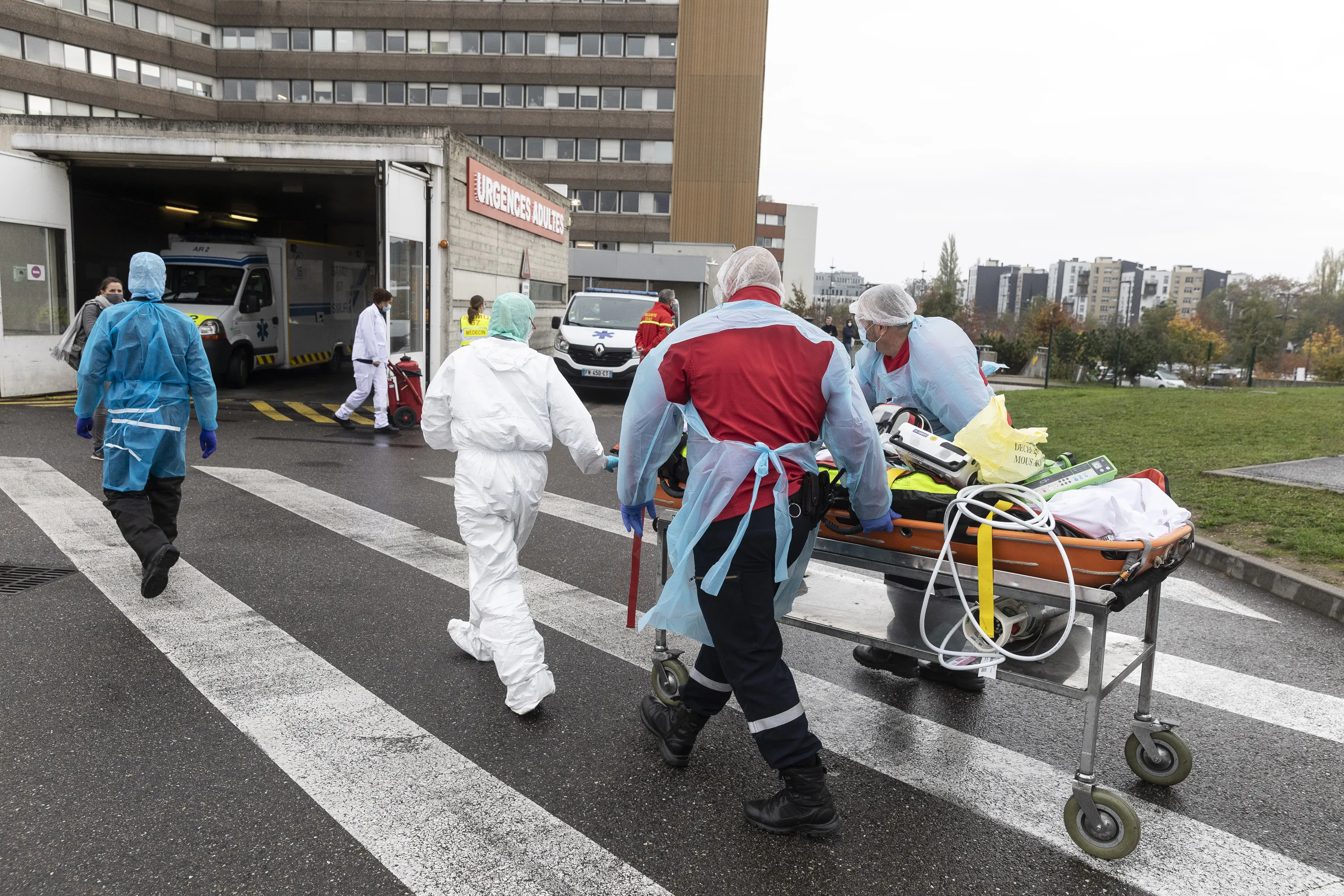 A patient infected with the COVID-19, coming from saturated hospitals in the Lyon region, is led to the Hautepierre hospital in Strasbourg, eastern France, Thursday, November 12, 2020. France has confirmed more virus infections in the pandemic than any other European country, and positive cases had been rising steadily since July. But over the past 10 days, the number of cases per 100,000 people has been dropping. (Photo by Jean-Francois Badias/AP Photo)