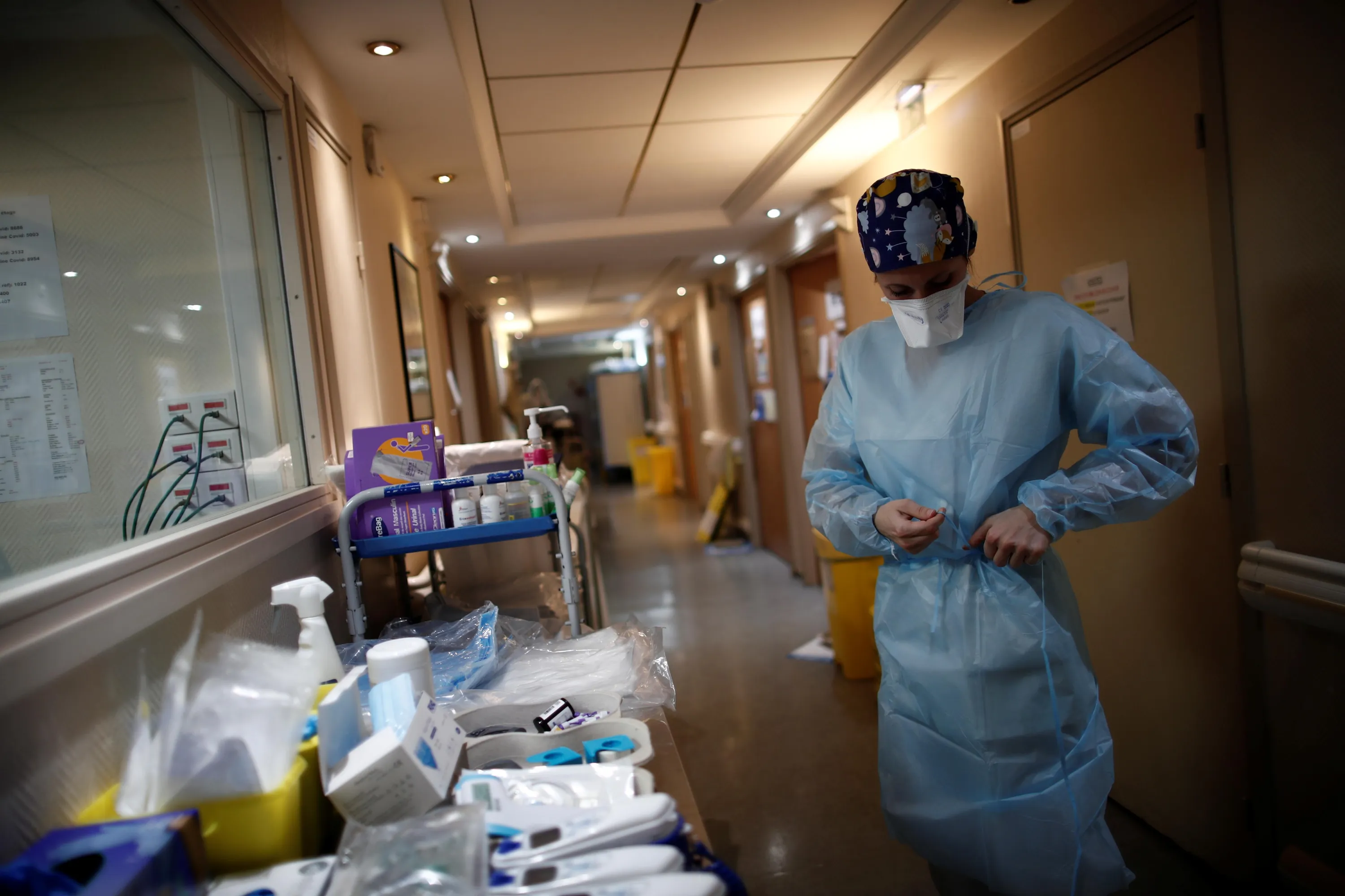 A medical staff member works in the Intensive Care Unit (ICU) where patients suffering from the coronavirus disease (COVID-19) are treated at Ambroise Pare clinic in Neuilly-sur-Seine, near Paris, France, November 12, 2020. (Photo by Benoit Tessier/Reuters)
