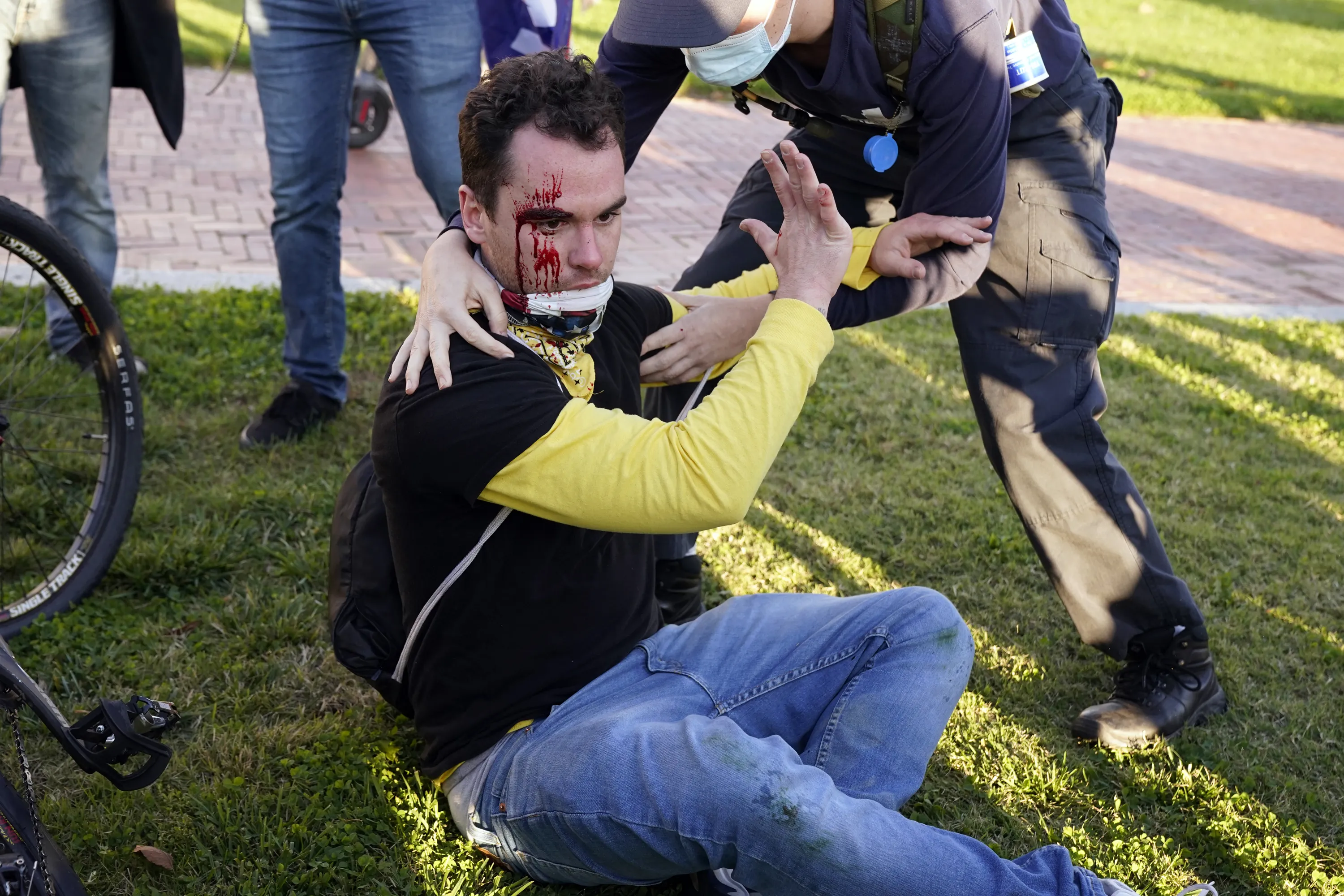 A counter-protester helps a supporter of President Donald Trump who was injured after he was attacked during a pro-Trump rally Saturday November 14, 2020, in Washington. (Photo by Jacquelyn Martin/AP Photo)