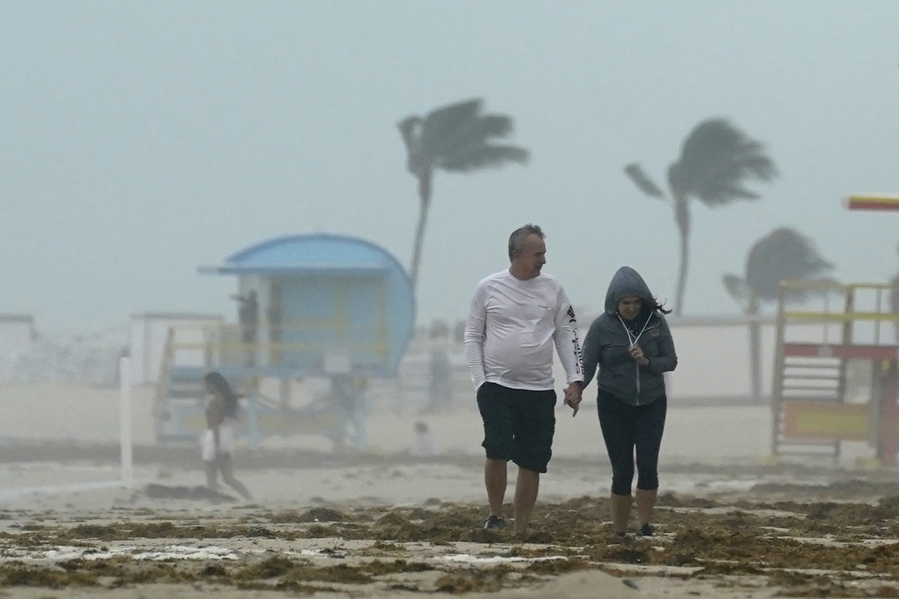 A couple walks along the beach during a downpour, Sunday, November 8, 2020, on Miami Beach, Florida's famed South Beach. A strengthening Tropical Storm Eta cut across Cuba on Sunday, and forecasters say it's likely to be a hurricane before hitting the Florida Keys Sunday night or Monday. (Photo by Wilfredo Lee/AP Photo)