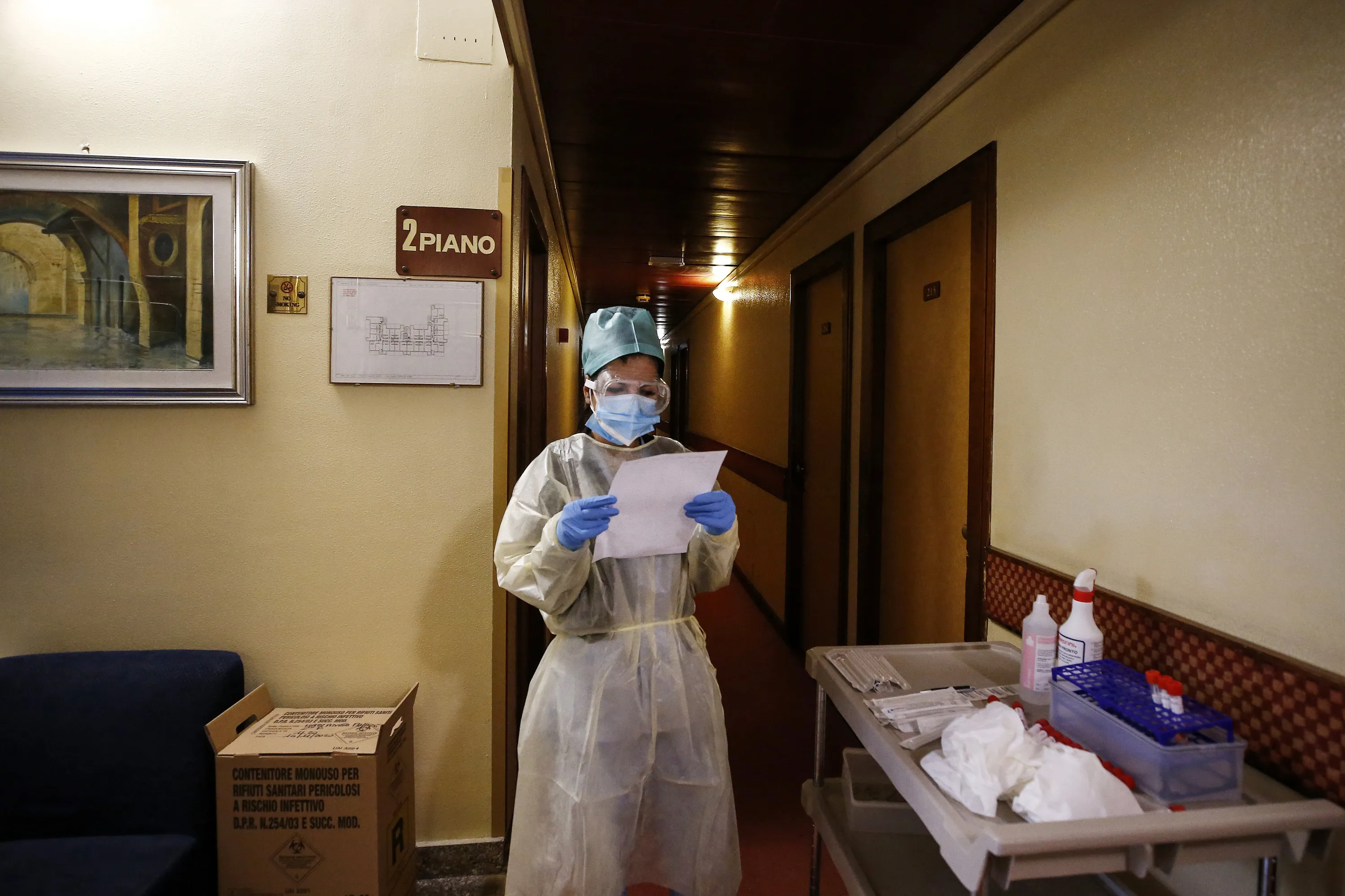 Medical staff of the Gemelli hospital checks a list as she tours the rooms of the Pineta Palace Hotel where patients recovering from COVID-19 are undergoing quarantine under the supervision of the Gemelli hospital, in Rome, Saturday, November 14, 2020. (Photo by Cecilia Fabiano/LaPresse via AP Photo)