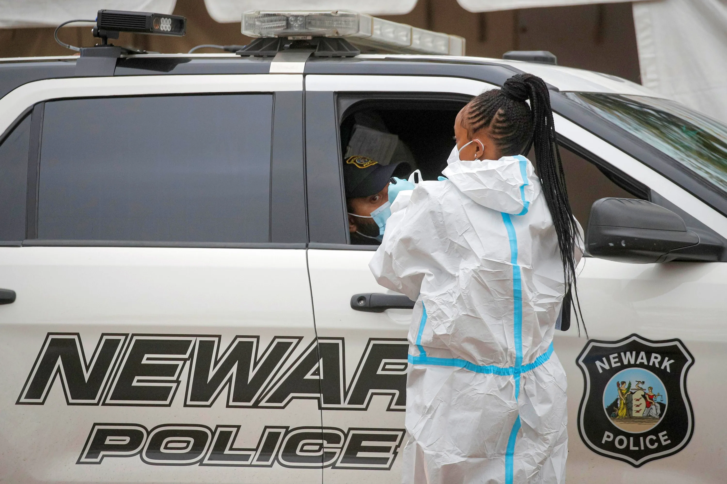 A healthcare worker takes a swab from a Newark Police officer sitting in a car at a drive-thru COVID-19 test center, during a surge in the coronavirus disease (COVID-19) infections in Newark, New Jersey, U.S., November 12, 2020. (Photo by Brendan McDermid/Reuters)