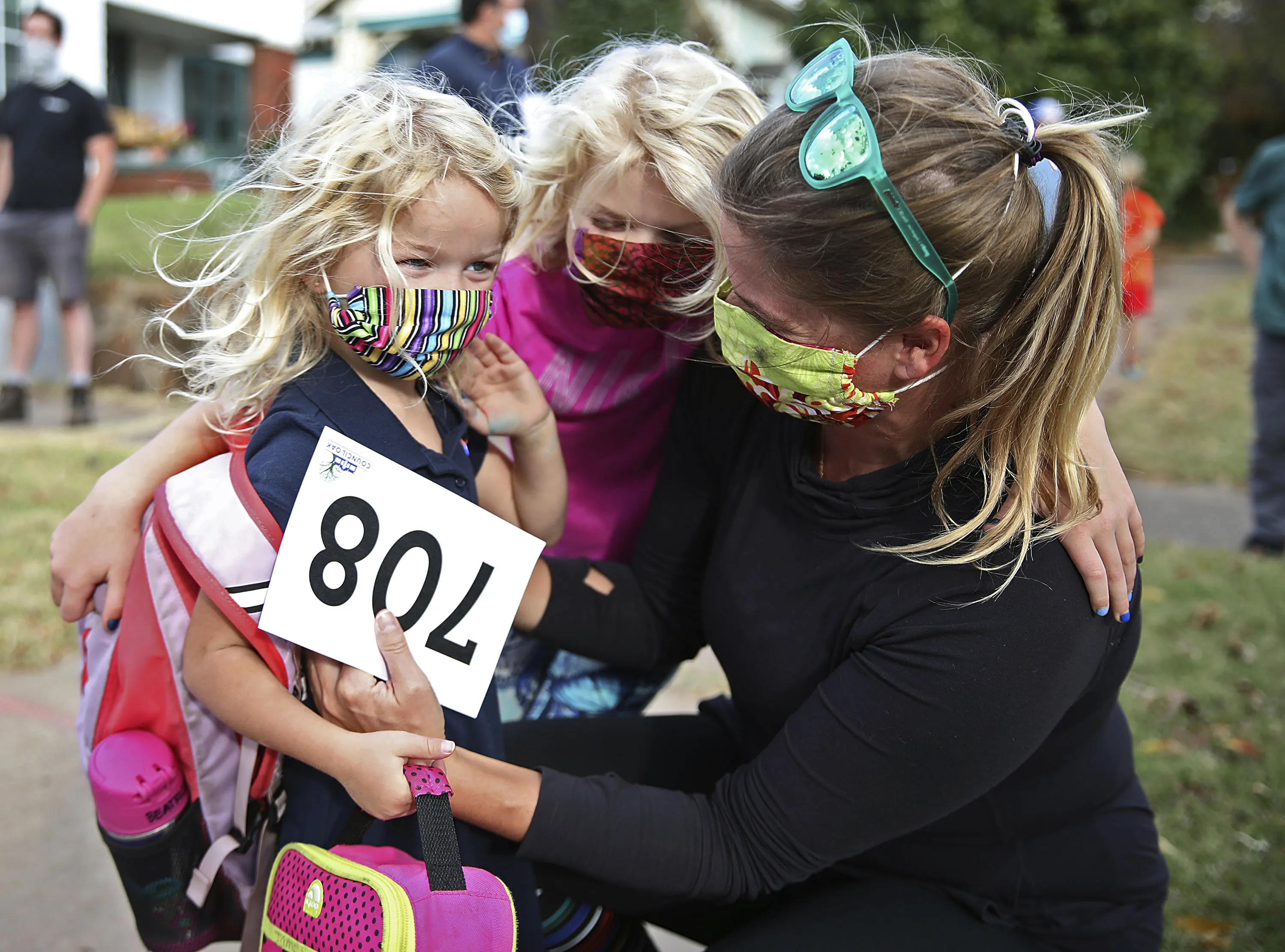 Beatrice James,5, left, is greeted by her sister Claudia, 7, and mother Sarah after her first day of pre-kindergarten at Council Oak Elementary School in Tulsa, Okla., Monday, November 9, 2020. Tulsa Public School returned to in-person instruction for kindergartners and pre-kindergartners on Monday, amid the coronavirus pandemic. (Photo by Mike Simons/Tulsa World via AP Photo)