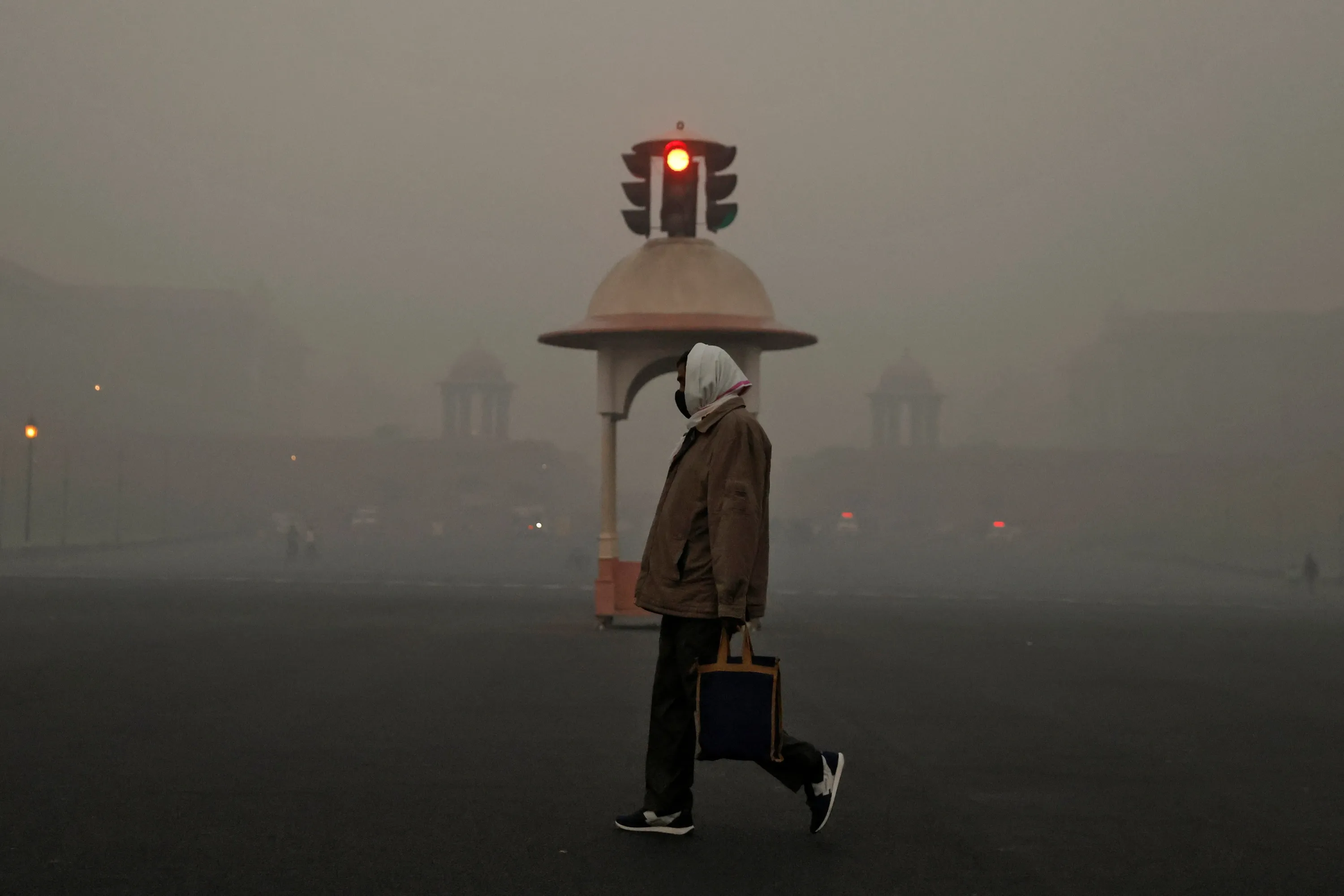 An office-goer walks past a traffic signal near various federal government ministries on a smoggy morning in New Delhi, India, November 10, 2020. (Photo by Danish Siddiqui/Reuters)