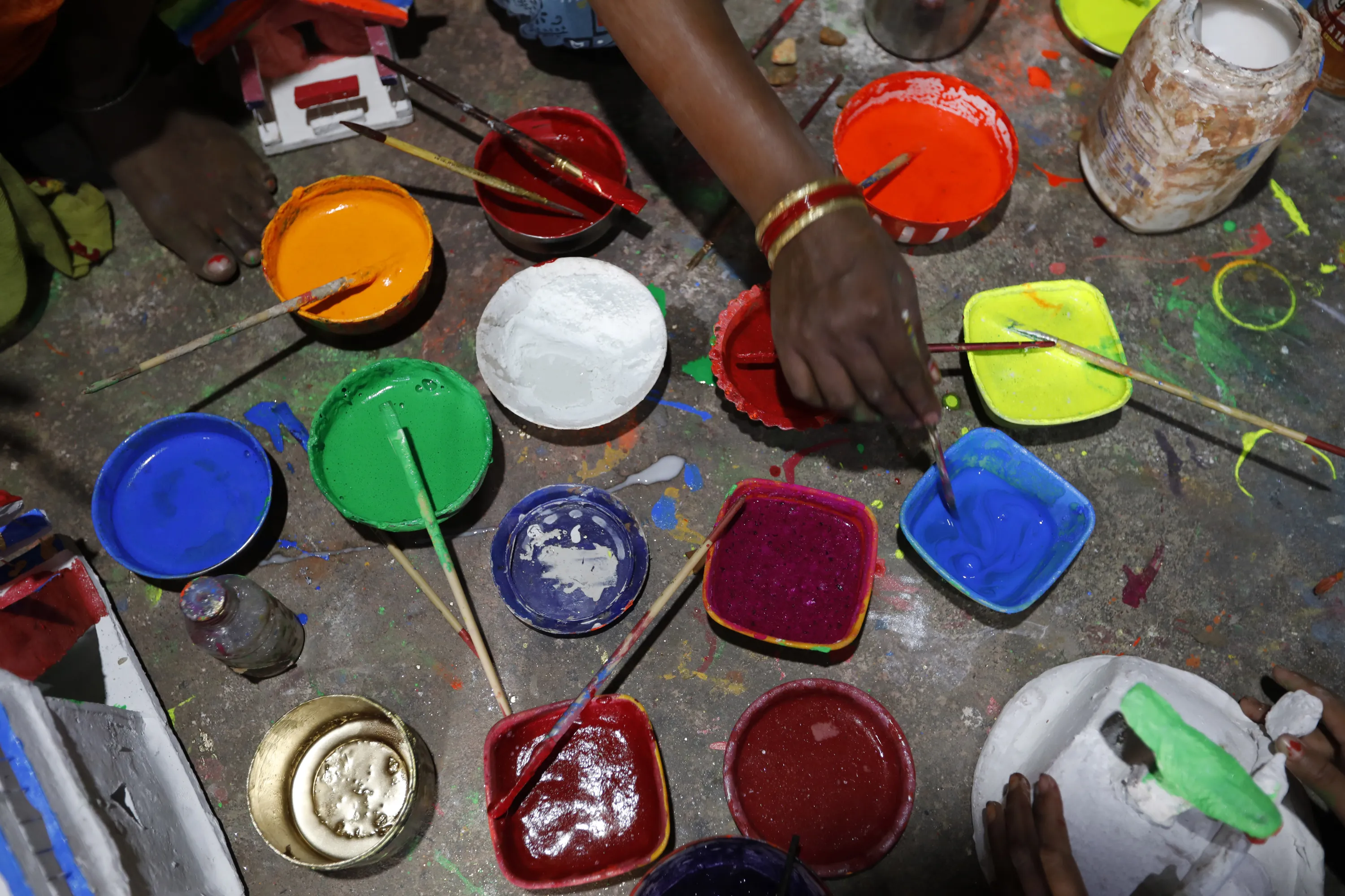 Indian women paint miniature models of houses as they make them for sale ahead of Diwali festival, in Prayagraj, India, Thursday, November 12, 2020. People buy them to decorate their homes during Diwali, the annual Hindu festival of lights which will be celebrated on Nov 14. (Photo by Rajesh Kumar Singh/AP Photo)