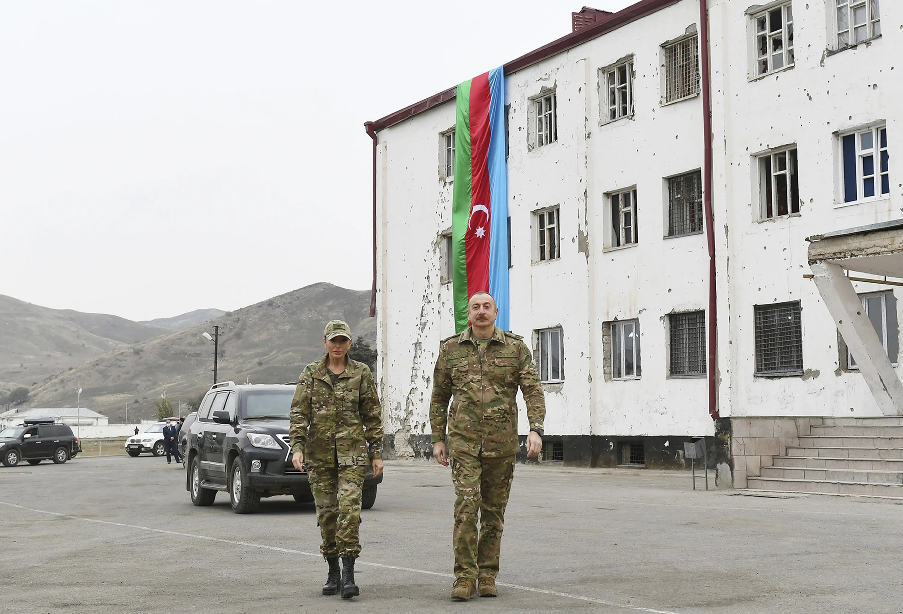 This handout photo provided Monday, November 16, 2020, by the Azerbaijan's Presidential Press Office, shows Azerbaijani President Ilham Aliyev and his wife and Azerbaijan's Vice President Mehriban Aliyeva visit the liberated from occupation Fuzuli and Jabrayil districts of Azerbaijan. Azerbaijan on Sunday postponed taking control of a territory ceded by Armenian forces in a cease-fire agreement, but denounced civilians leaving the area for burning houses and committing what it called “ecological terror”. (Photo by Vugar Amrullayev/Azerbaijani Presidential Press Office via AP Photo)
