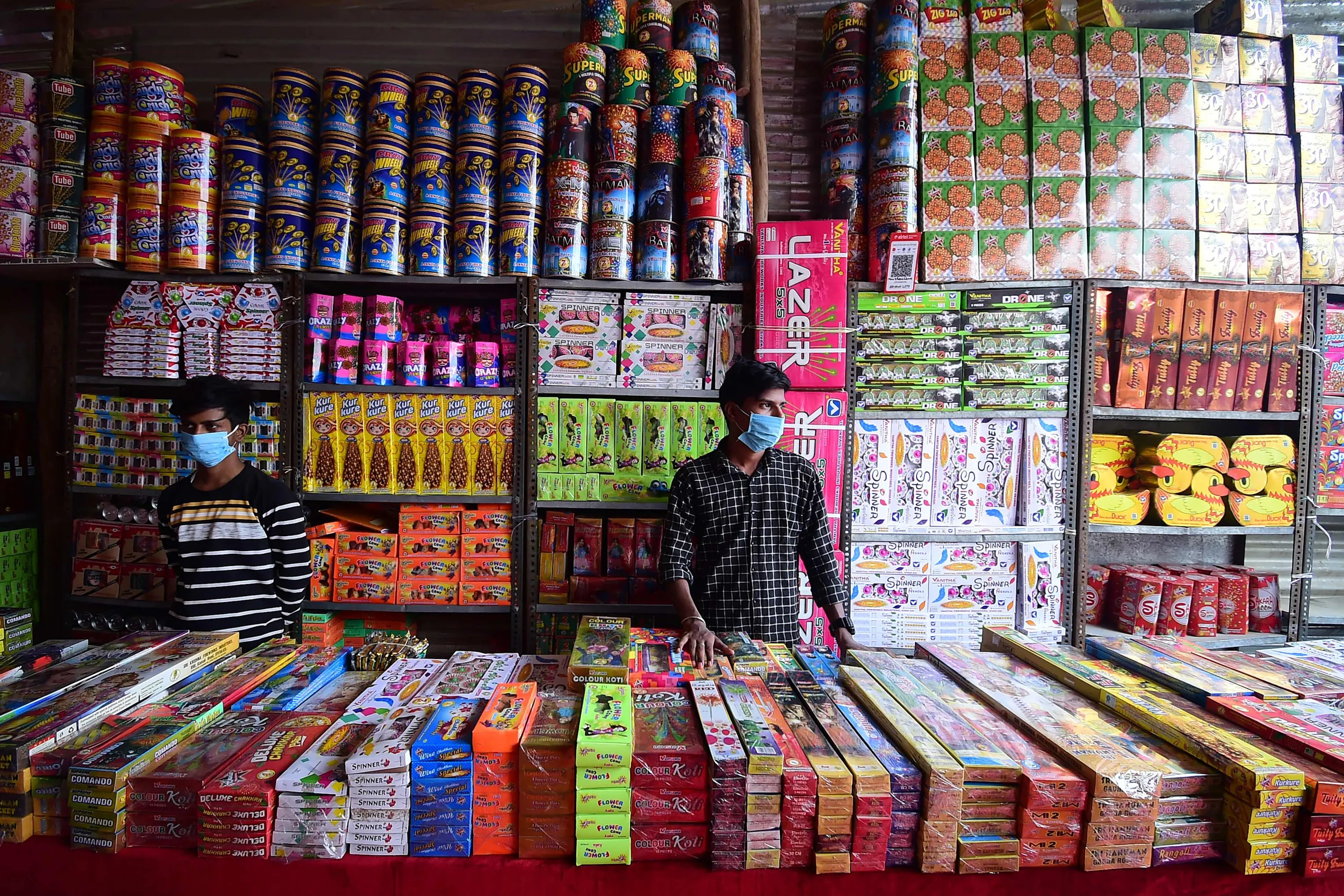 Firecracker vendors wait for customers at a market ahead of Diwali, the Hindu festival of lights, in Allahabad on November 9, 2020. (Photo by Sanjay Kanojia/AFP Photo)