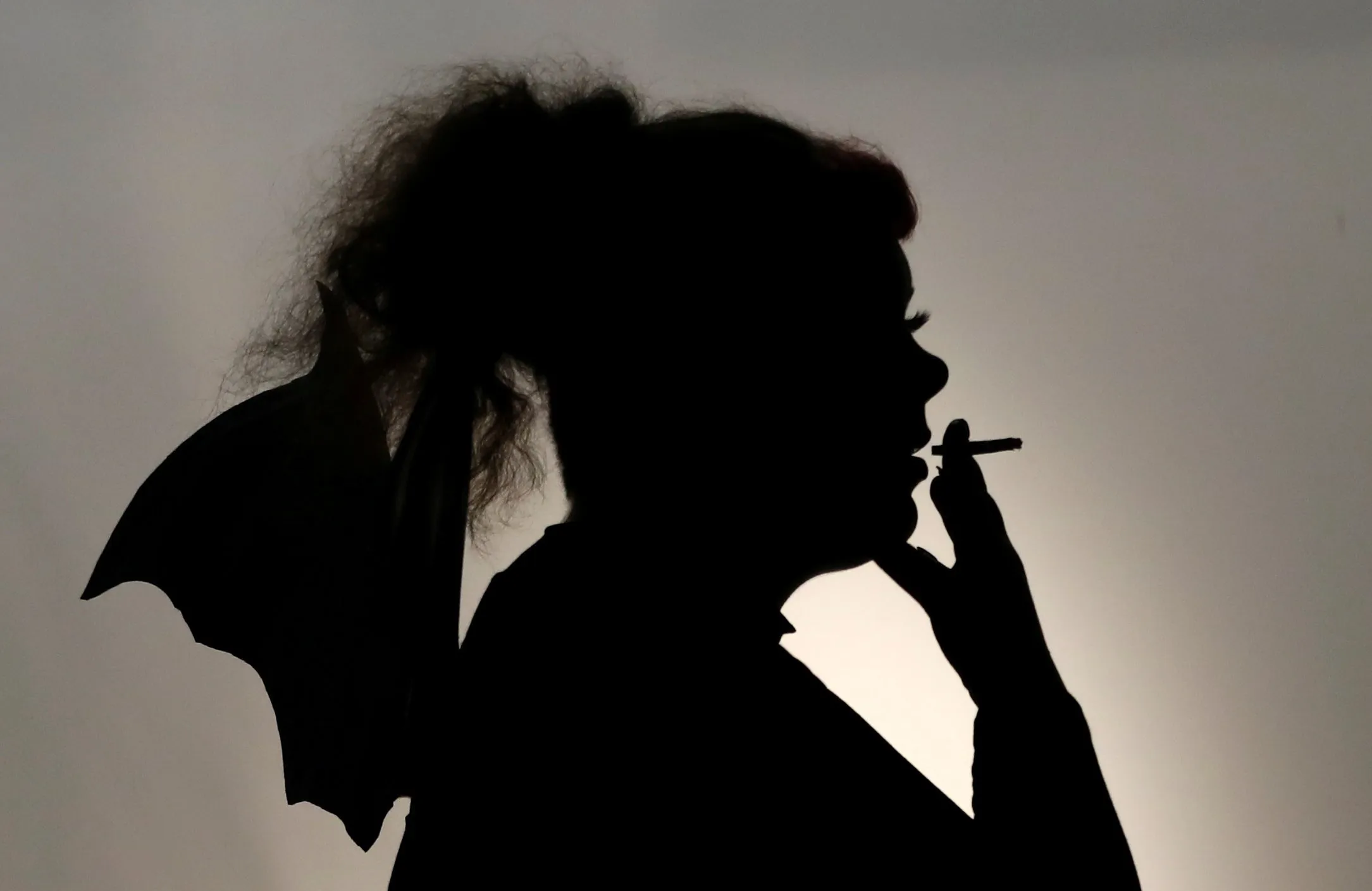 A woman wearing Halloween bat wings smokes in Durham, Britain on October 31, 2020. (Photo by Lee Smith/Reuters)