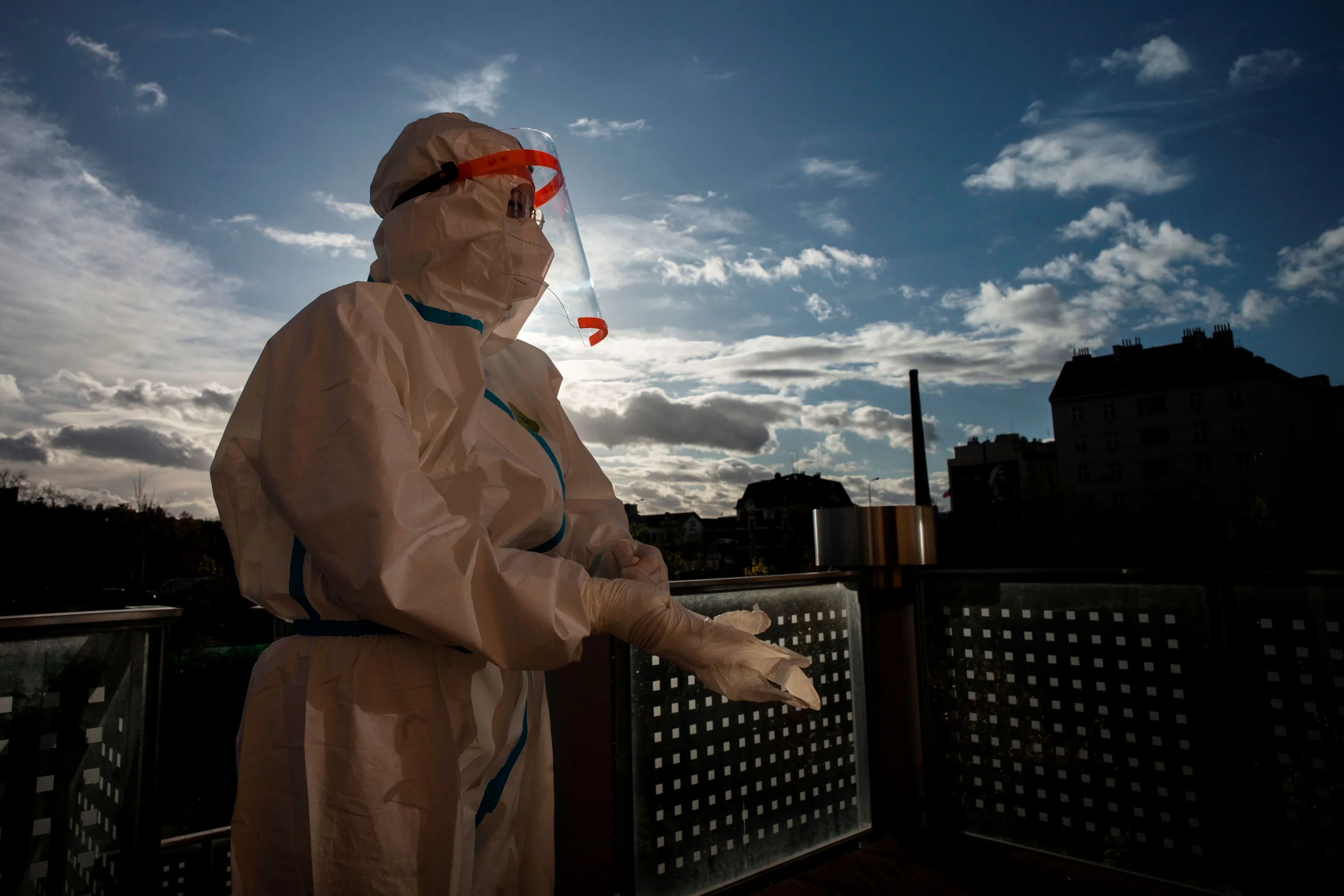 A medical worker wearing protective equipment puts on her gloves on the balcony of the nursing house on November 16, 2020 in Prague. The Czech Republic confirmed 1,887 COVID-19 cases on Sunday, which is the lowest daily rise since October 5, according to the latest data that the Health Ministry released on its website today. (Photo by Michal Cizek/AFP Photo)