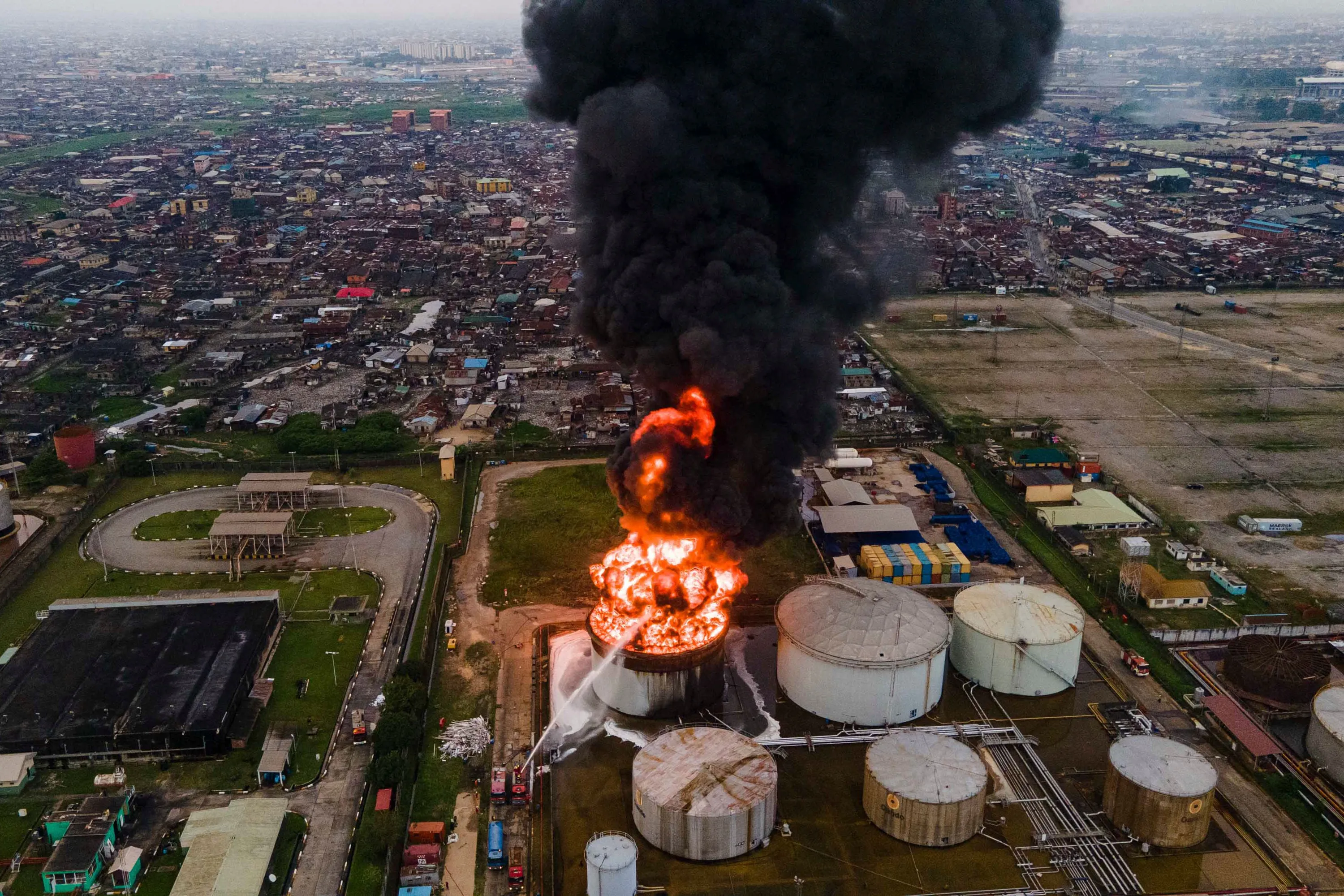An aerial view shows an oil tanker on fire at the OVH Energy Marketing (a licensee of the Oando retail brand and ASPM Limited) in Apapa, Lagos, on November 5, 2020. The cause of the fire is still unknown at this point but the fire service is on the ground to control the fire outbreak. (Photo by Benson Ibeabuchi/AFP Photo)