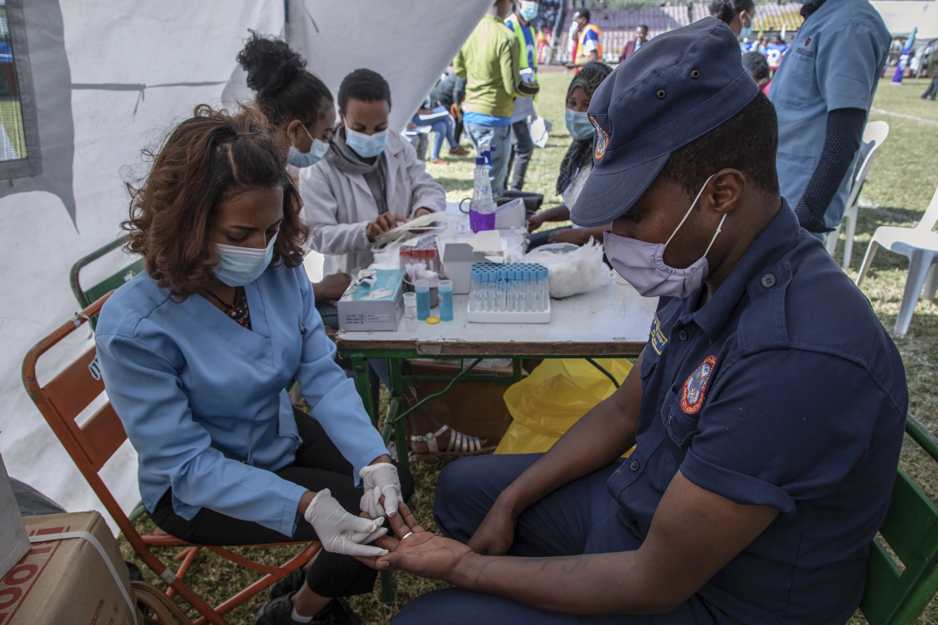 A city compliance official gives blood at a blood drive in support of the country's military, at a stadium in the capital Addis Ababa, Ethiopia Thursday, November 12, 2020. Rallies occurred in multiple cities in support of the federal government's military offensive against the Tigray regional government, the Tigray People's Liberation Front. (Photo by Mulugeta Ayene/AP Photo)