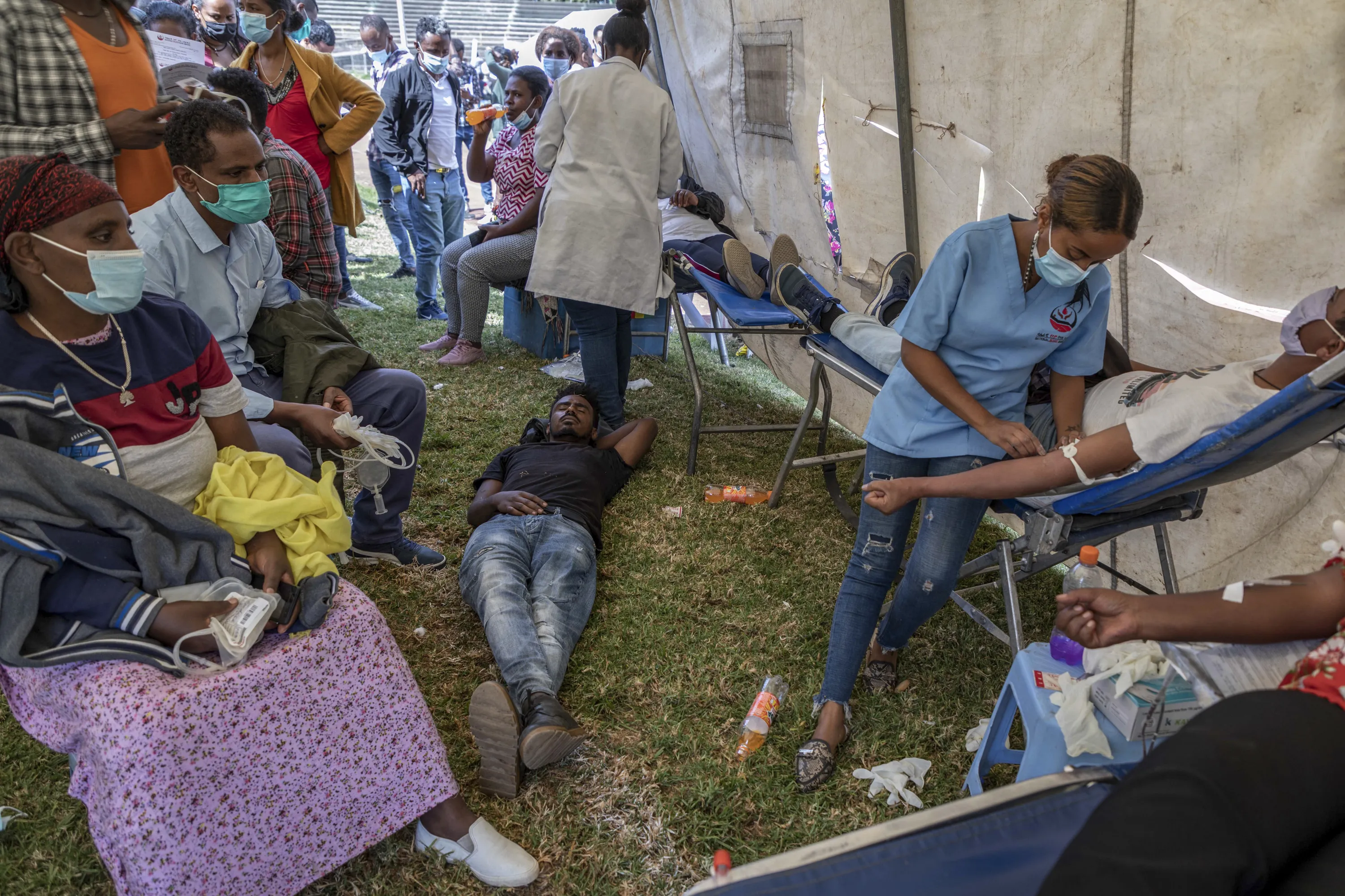 A man lies down after giving blood at a blood drive in support of the country's military, at a stadium in the capital Addis Ababa, Ethiopia Thursday, November 12, 2020. (Photo by Mulugeta Ayene/AP Photo)