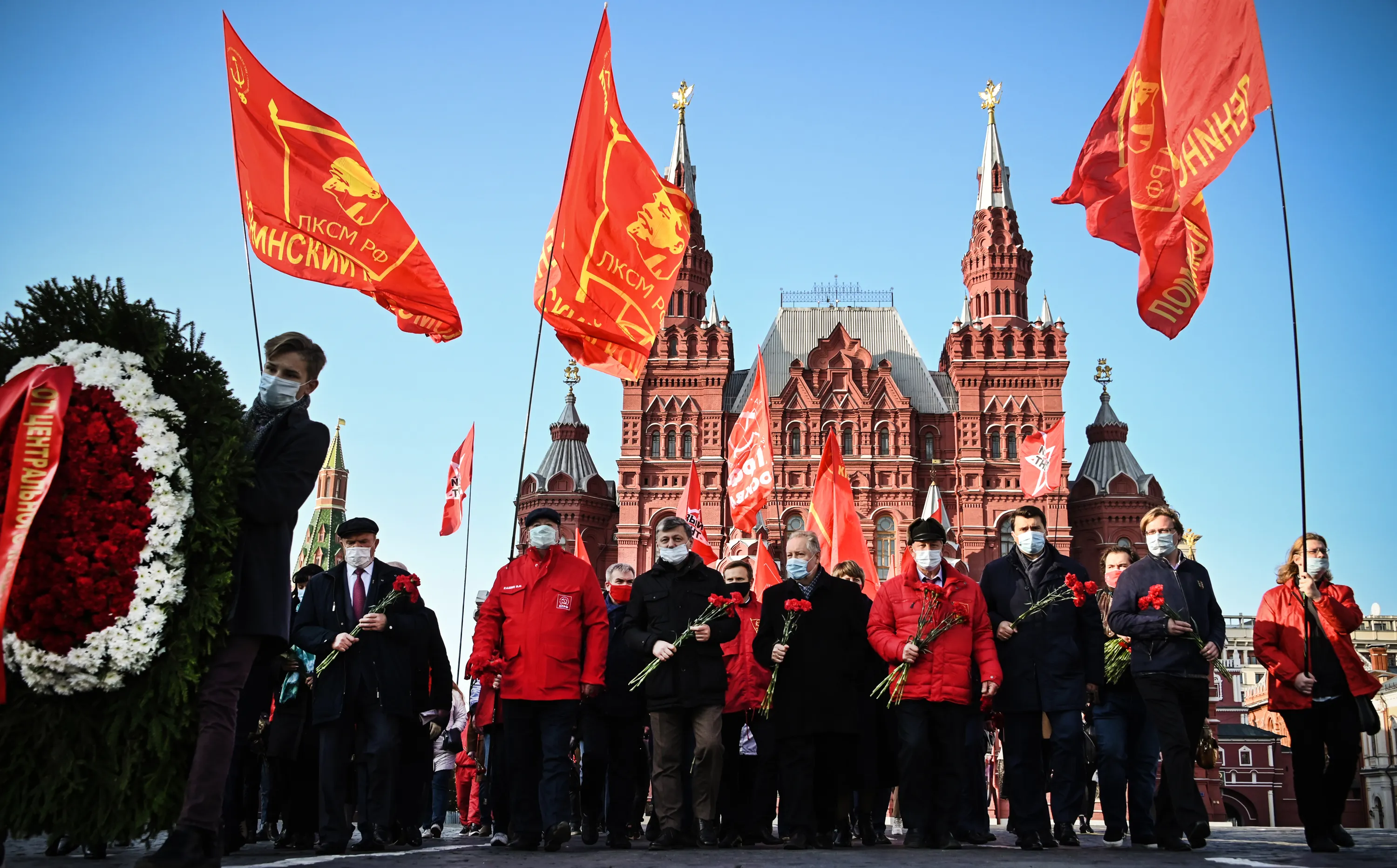 Russian Communist supporters march towards the Mausoleum of Vladimir Lenin to lay flowers on the 102nd anniversary of the Komsomol on Red Square in Moscow on October 28, 2020. Komsomol, The All-Union Leninist Young Communist League, was a political youth organisation in the Soviet Union, the youth division of the Soviet Communist Party, established in 1918 and died shortly after the collapse of the Soviet Empire in 1991. (Photo by Alexander Nemenov/AFP Photo)