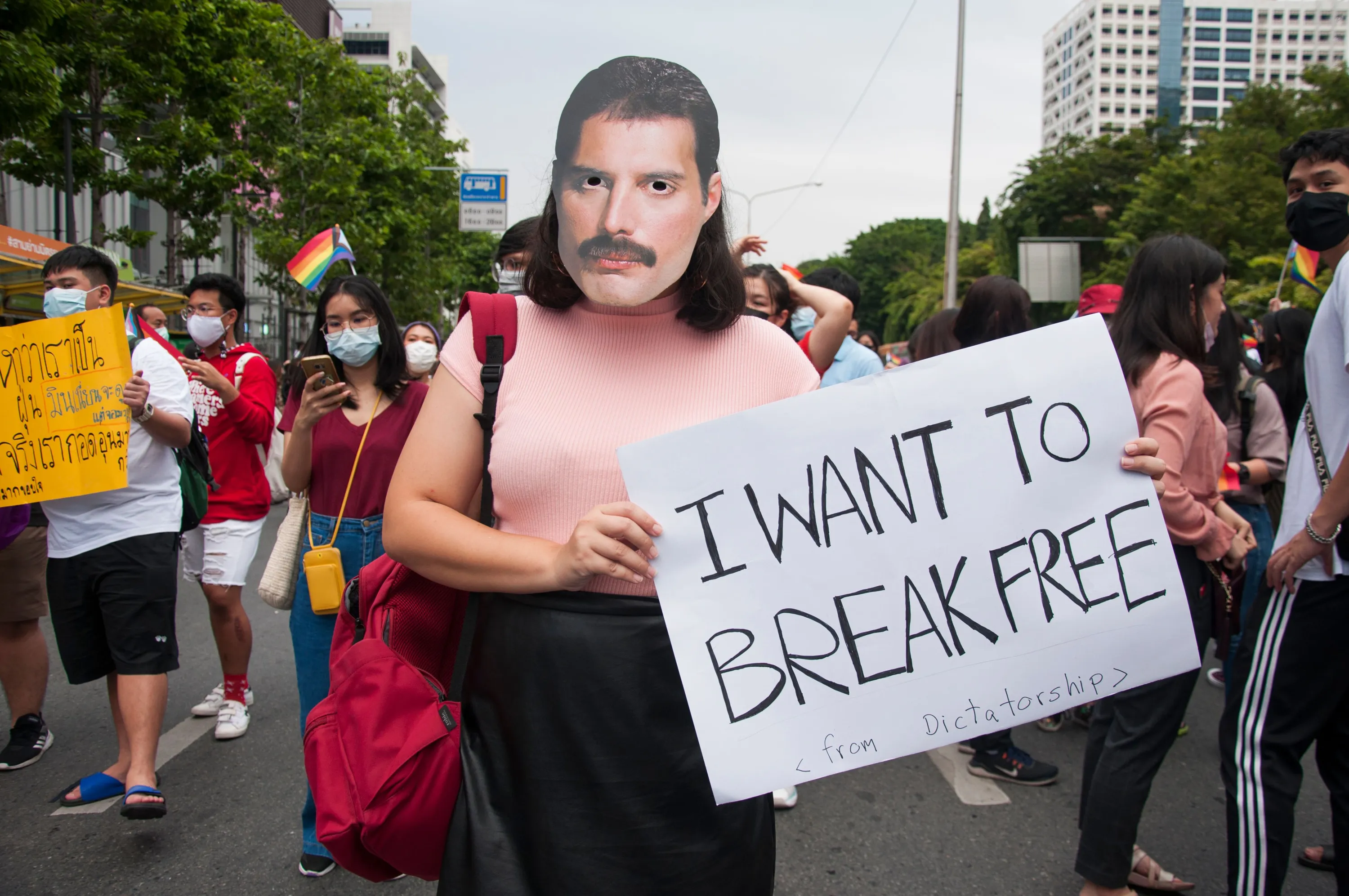 A protester wearing a hand-made paper mask of Freddie Mercury holds a placard during the demonstration in Bangkok, Thailand on November 7, 2020. LGBTQ+ and pro-democracy protesters march from Samyan Intersection to Silom in the centre of Bangkok to call for LGBTQ+ rights and the end of sexual harassment, the protesters also demanded the resignation of Thailand Prime Minister and the reform of the monarchy. (Photo by Peerapon Boonyakiat/SOPA Images/Rex Features/Shutterstock)