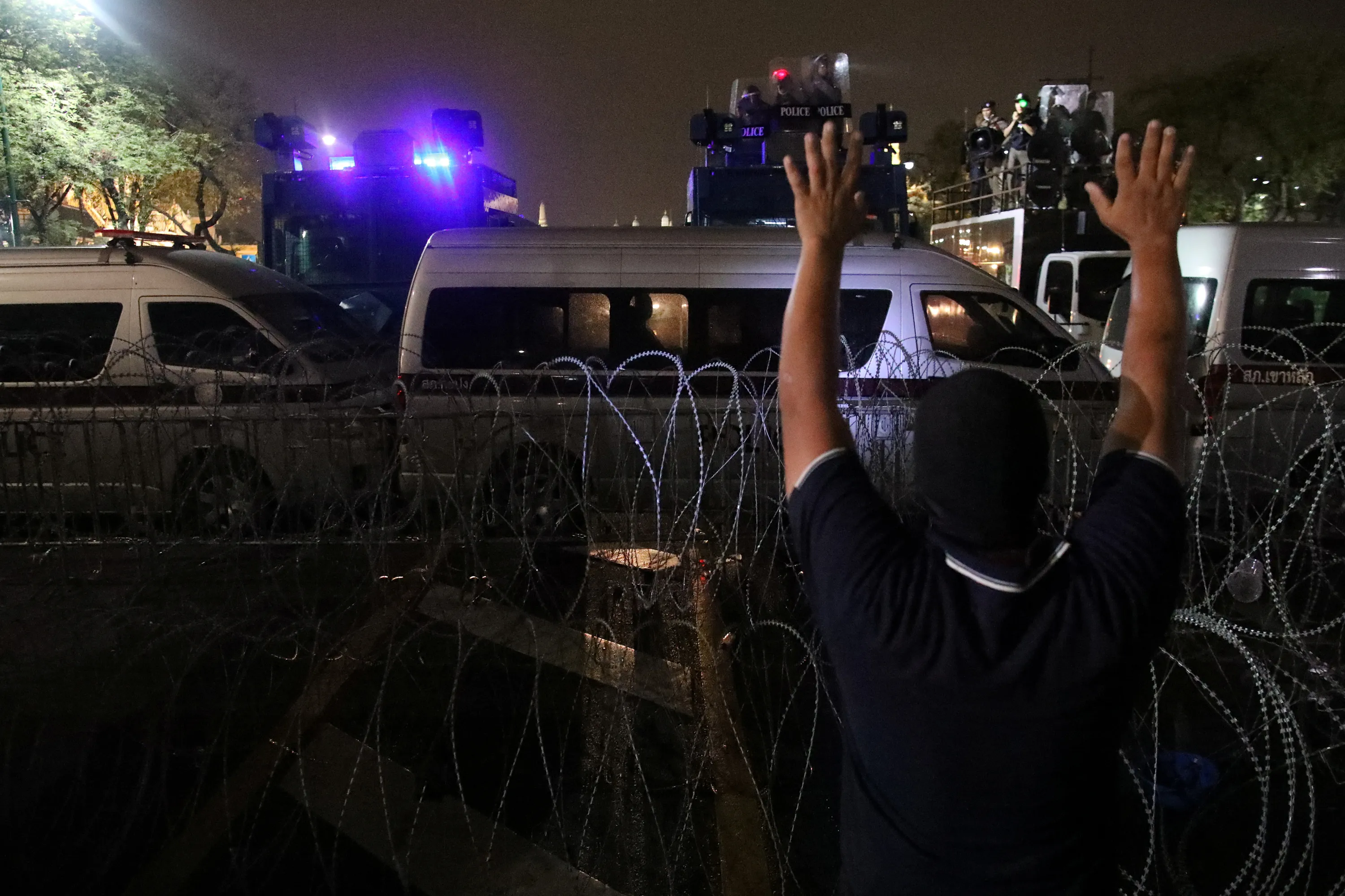 A demonstrator gestures towards police, during a rally to call for the ouster of Prime Minister Prayuth Chan-ocha's government and reforms in the monarchy in Bangkok, Thailand, November 8, 2020. (Photo by Soe Zeya Tun/Reuters)