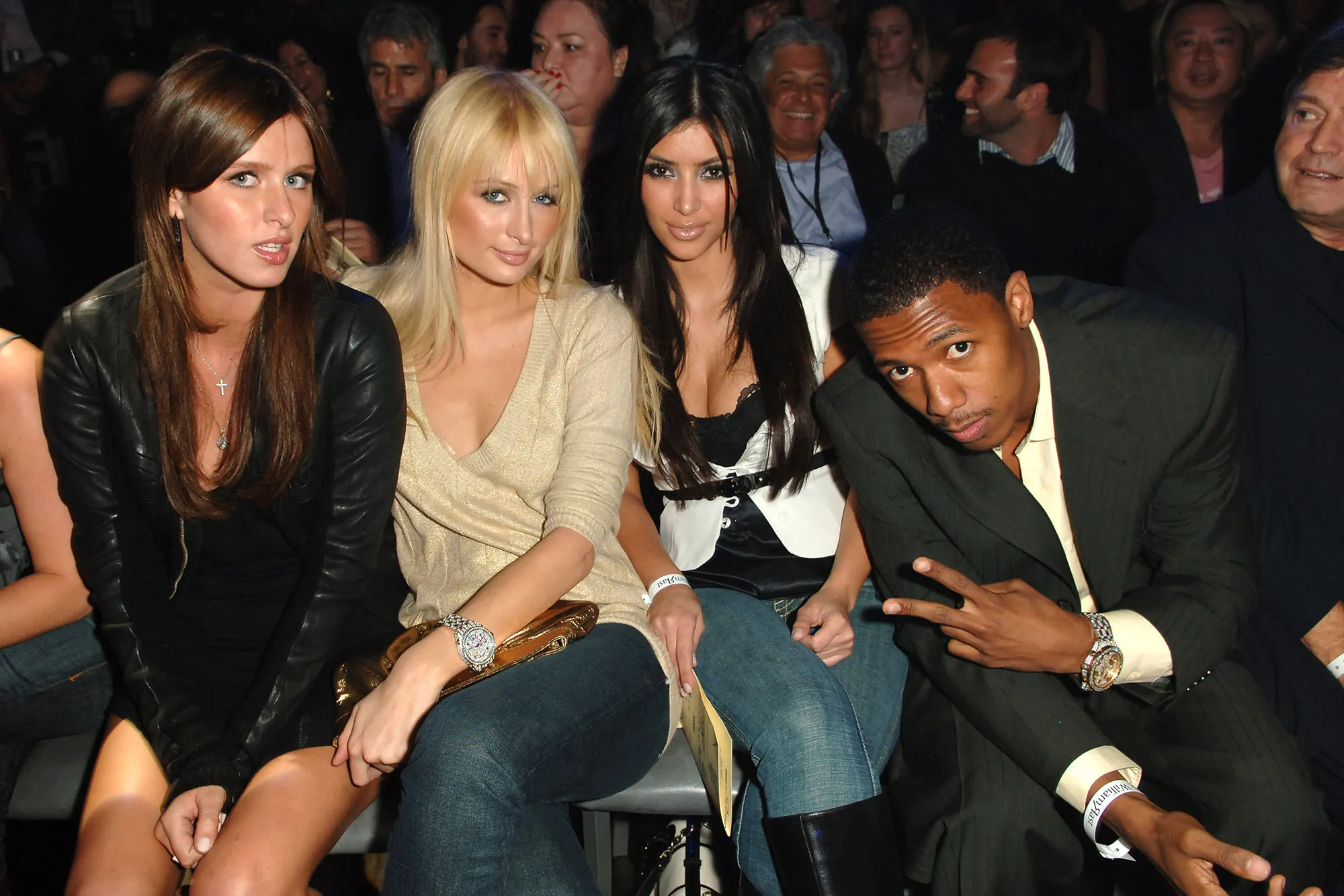 Nicky Hilton, Paris Hilton, Kim Kardashian and Nick Cannon in Hollywood on October 17, 2006. (Photo by M. Caulfield/WireImage for William Rast)